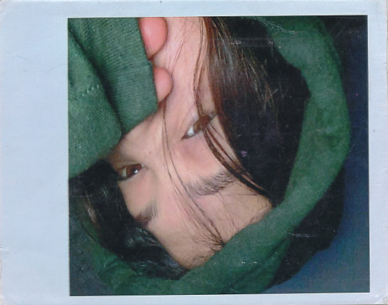 La imagen es un primer plano de un rostro con piel de tono medio, parcialmente cubierto por una tela de color verde oscuro. Se ven claramente dos ojos oscuros y parte del cabello oscuro. La persona parece estar mirando hacia la cámara. La tela envuelve parte de la cara, creando una sensación de misterio o timidez. La iluminación es suave, resaltando los ojos como punto focal.