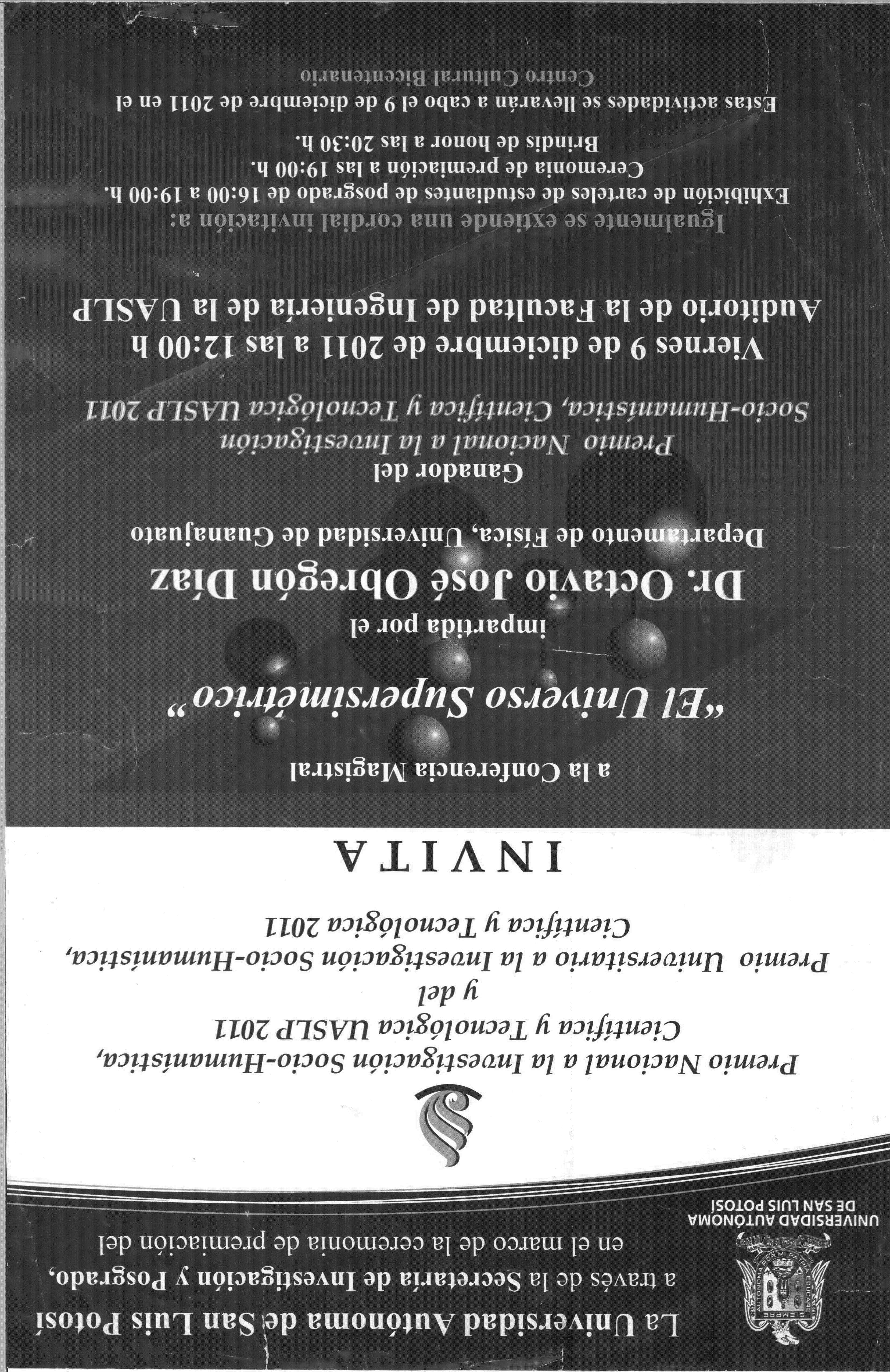 Es un cartel de invitación a una conferencia magistral impartida por el Dr. Octavio José Obregón Díaz, del Departamento de Física de la Universidad de Guanajuato. Se realiza en el marco de la premiación del Premio Nacional y Universitario a la Investigación Socio-Humanística, Científica y Tecnológica UASLP 2011.
