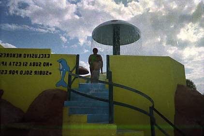 Fotografía que captura a Héctor Rodríguez de niño debajo de un hongo tirando agua