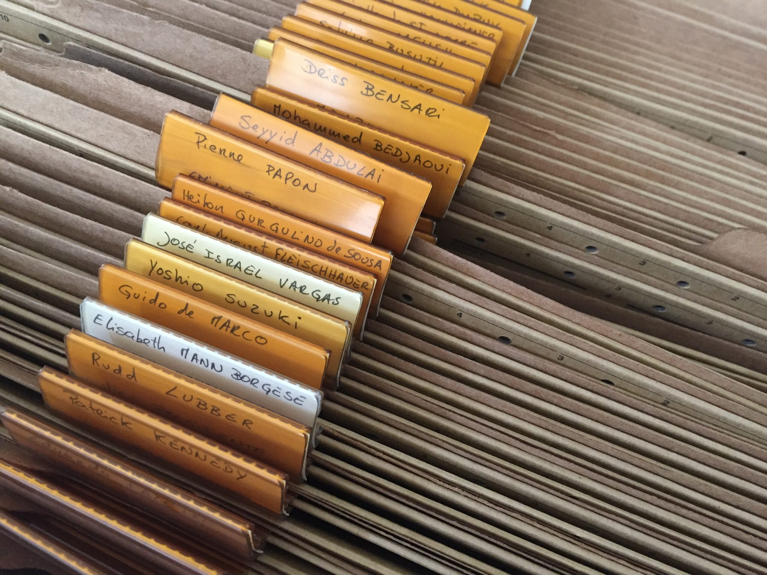 Fotografía de expedientes con identificadores o etiquetas por nombre y apellido.