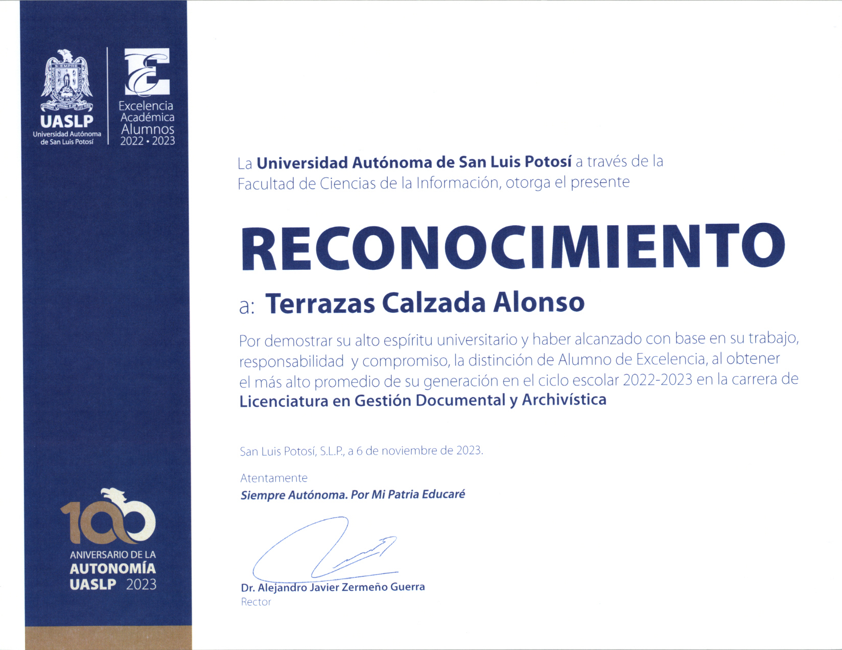 Certificado otorgado a Terrazas Calzada Alonso por su alto espíritu universitario y excelencia académica, al haber obtenido el más alto promedio de su generación en la Licenciatura en Gestión Documental y Archivística en el ciclo escolar 2022-2023.