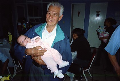 En esta imagen se captura el momento en el que una bebé es cargada por su abuelo durante una fiesta familiar celebrando su bautizo