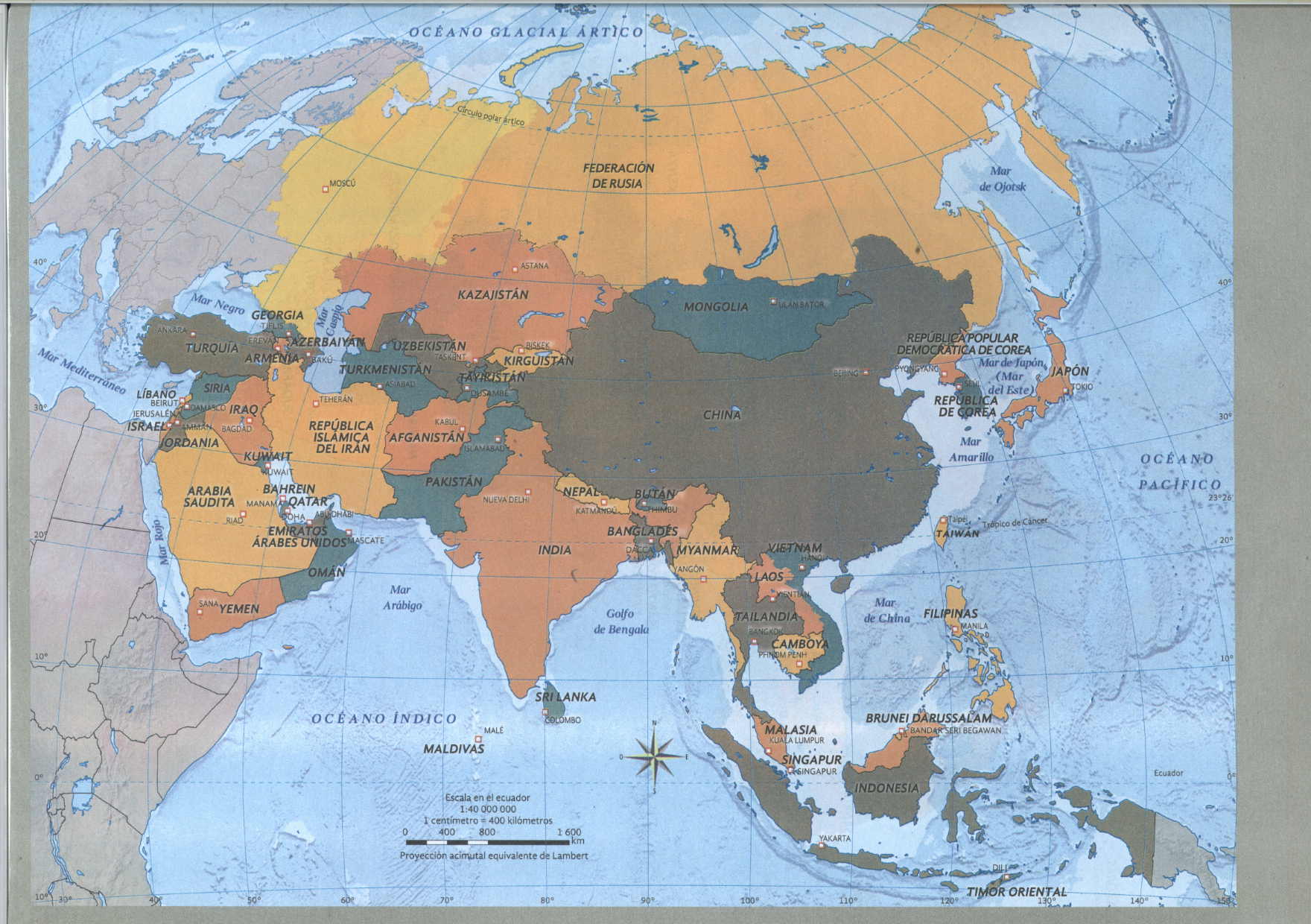 La imagen representa por diferentes colores los paises del continente de Asia, entre los oceanos Glacial Artíco, Indico y Pacifico.