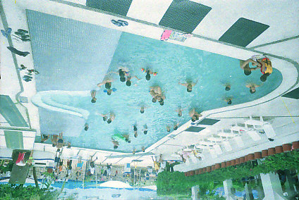 La imagen muestra una alberca en un hotel con vista al mar, la cual muestra una gran cantidad de personas disfrutando de ella.