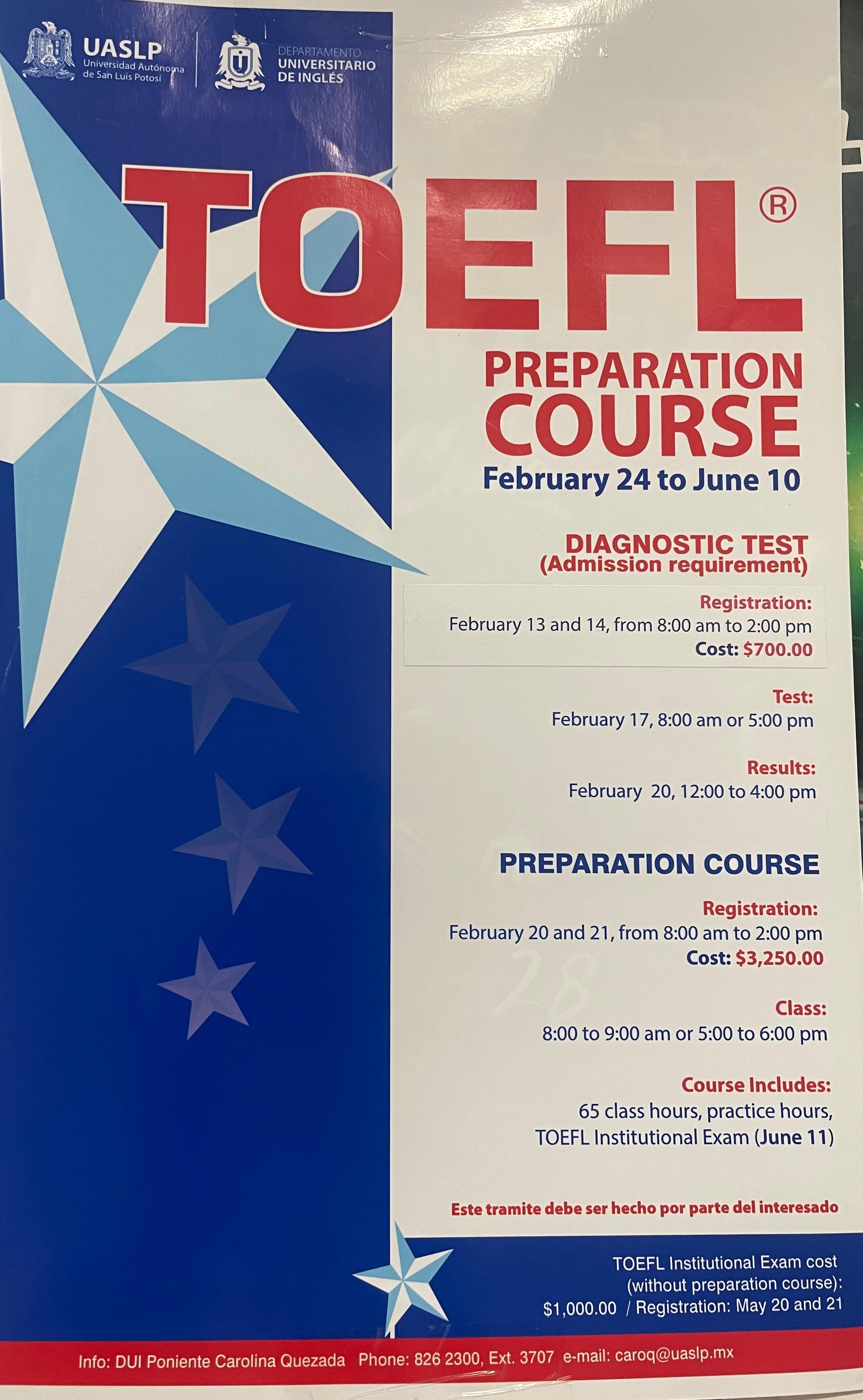 Cartel que invita a inscribirse al curso de preparación para el certificado TOEFL, ofrecido por el Departamento Universitario de Inglés.