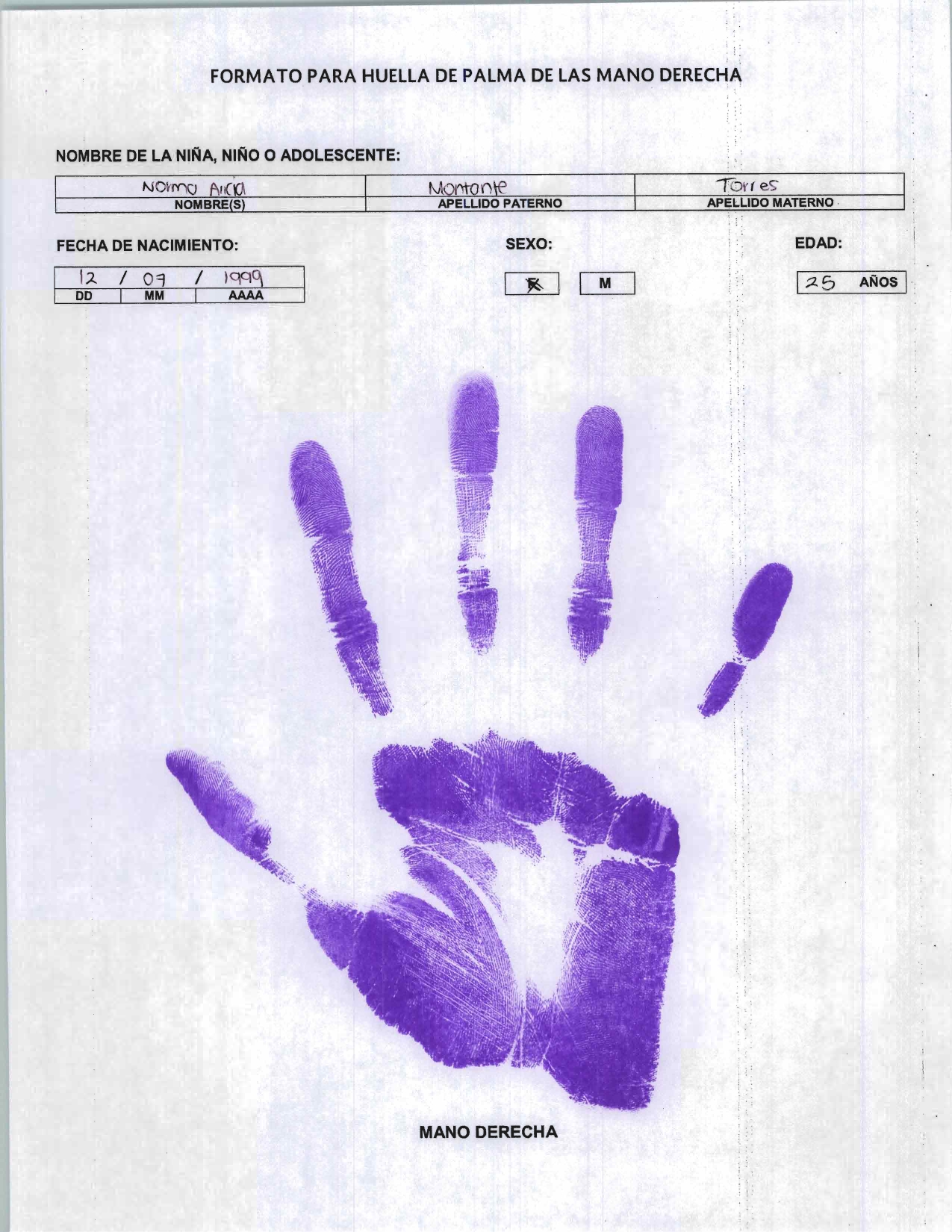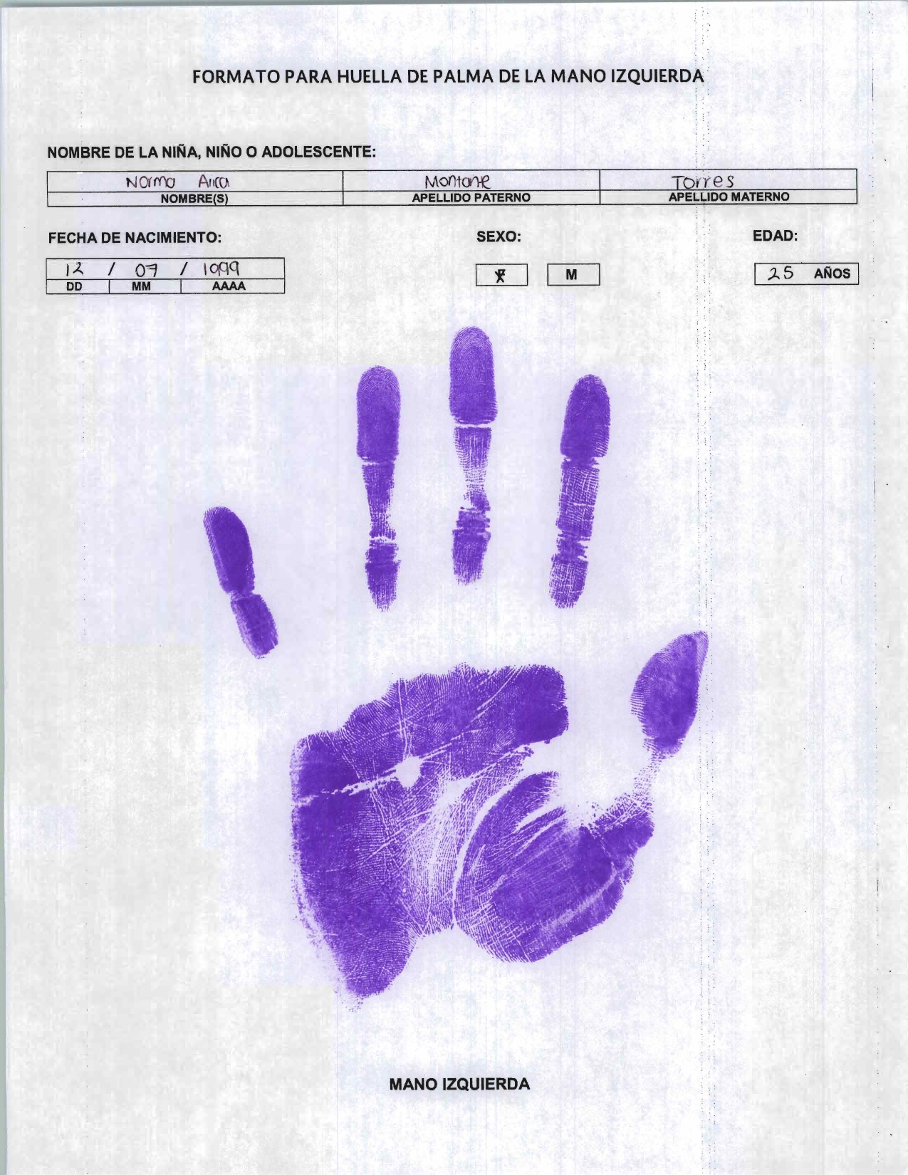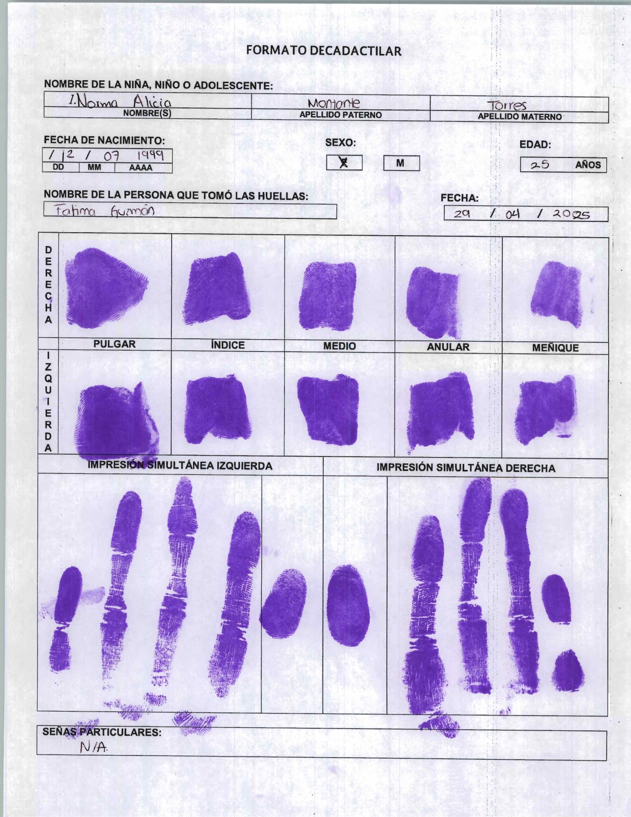 Registro biométrico que contiene las impresiones dactilares de los diez dedos de una persona, utilizado principalmente por instituciones policiales, judiciales y de identificación civil para verificar la identidad de un individuo, facilitar investigaciones y mantener antecedentes. Contiene datos personales y técnicos sobre las huellas.