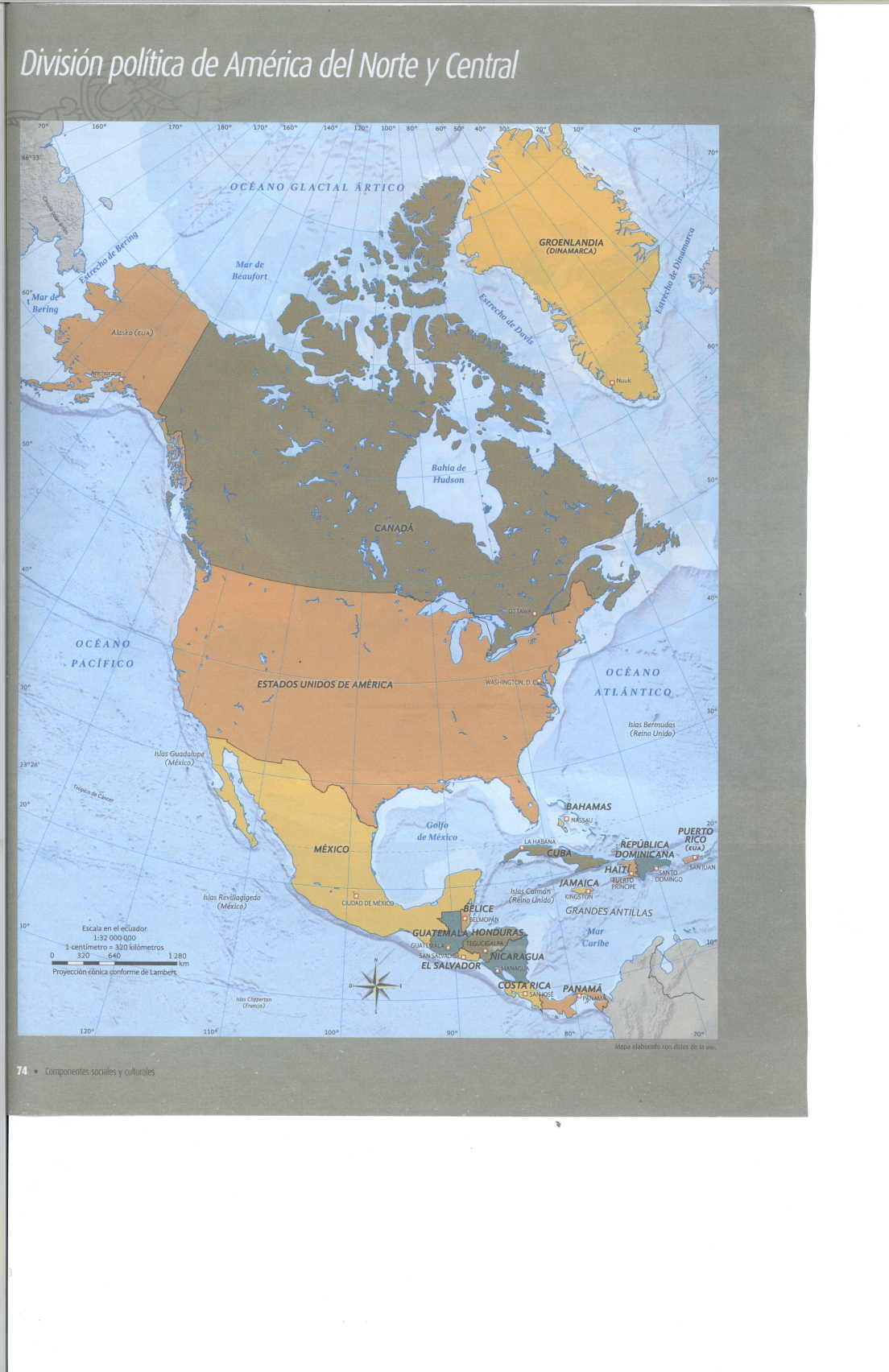 Mapa de la división de política de América del Norte y Central, aquí se muestra la división podemos ver la formación de cada estado o distrito, este mapa lo podemos encontrar en el libro de Atlas de México.