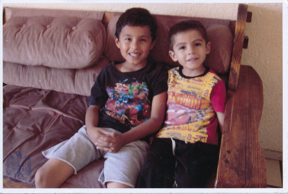 Retrato de los niños Leonardo y su primo Emilio viendo caricaturas
