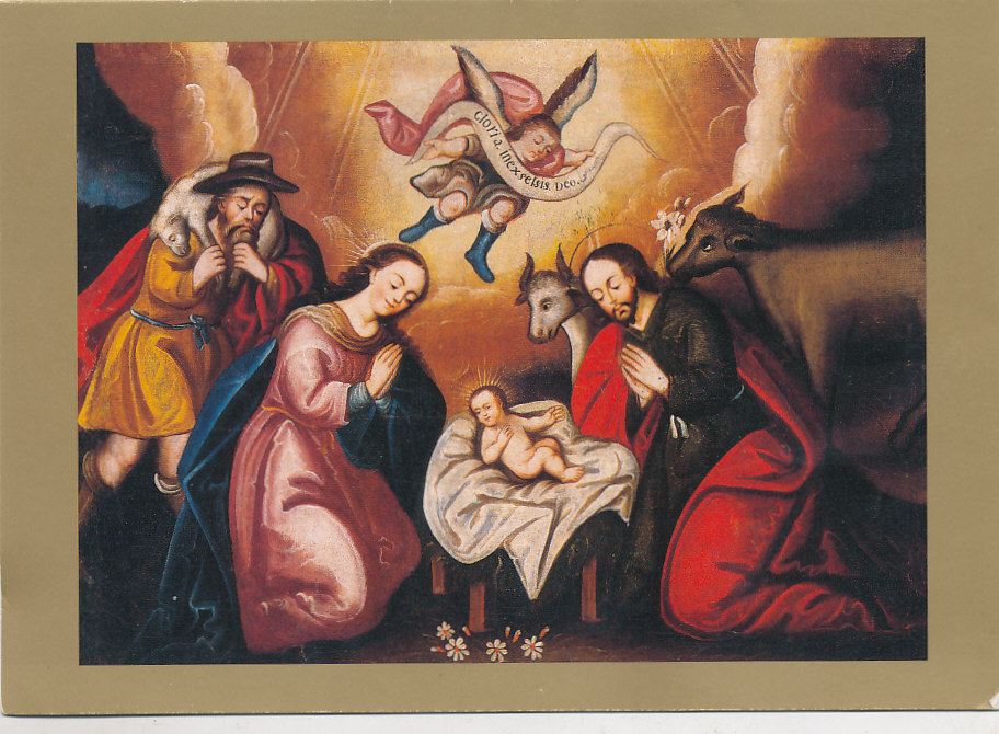 La imagen ilustra la escena tradicional del nacimiento de Jesús. En el centro, el Niño Jesús yace en un pesebre, velado por María y José en actitud de adoración. Un pastor se acerca con humildad, mientras que un ángel sobrevuela anunciando la gloria celestial. La escena evoca un ambiente de paz y trascendencia.