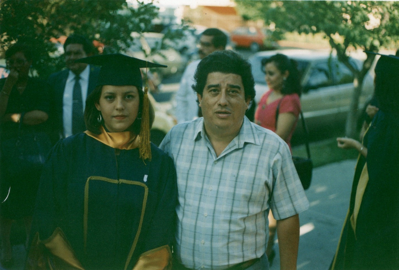 En esta fotografia se puede ver dos personas, una mas grande que otra (papá y hija) en un evento de graduacion, la hija va vestida acorde a una graduacion y se puede apreciar al fondo otros jovenes con el mismo atuendo