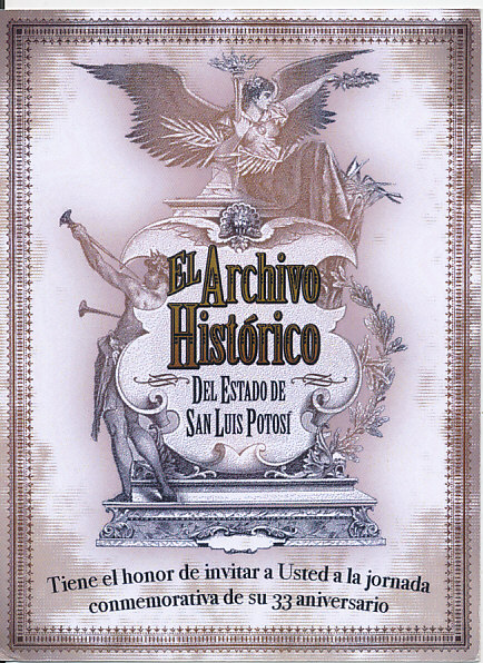 La imagen presenta una invitación formal emitida por el Archivo Histórico del Estado de San Luis Potosí para conmemorar su 33° aniversario.