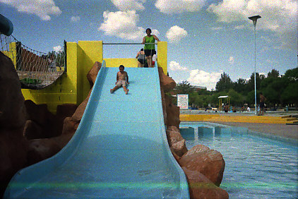 Fotografía que captura a Héctor Rodríguez de niño bajando de un tobogan grande azul