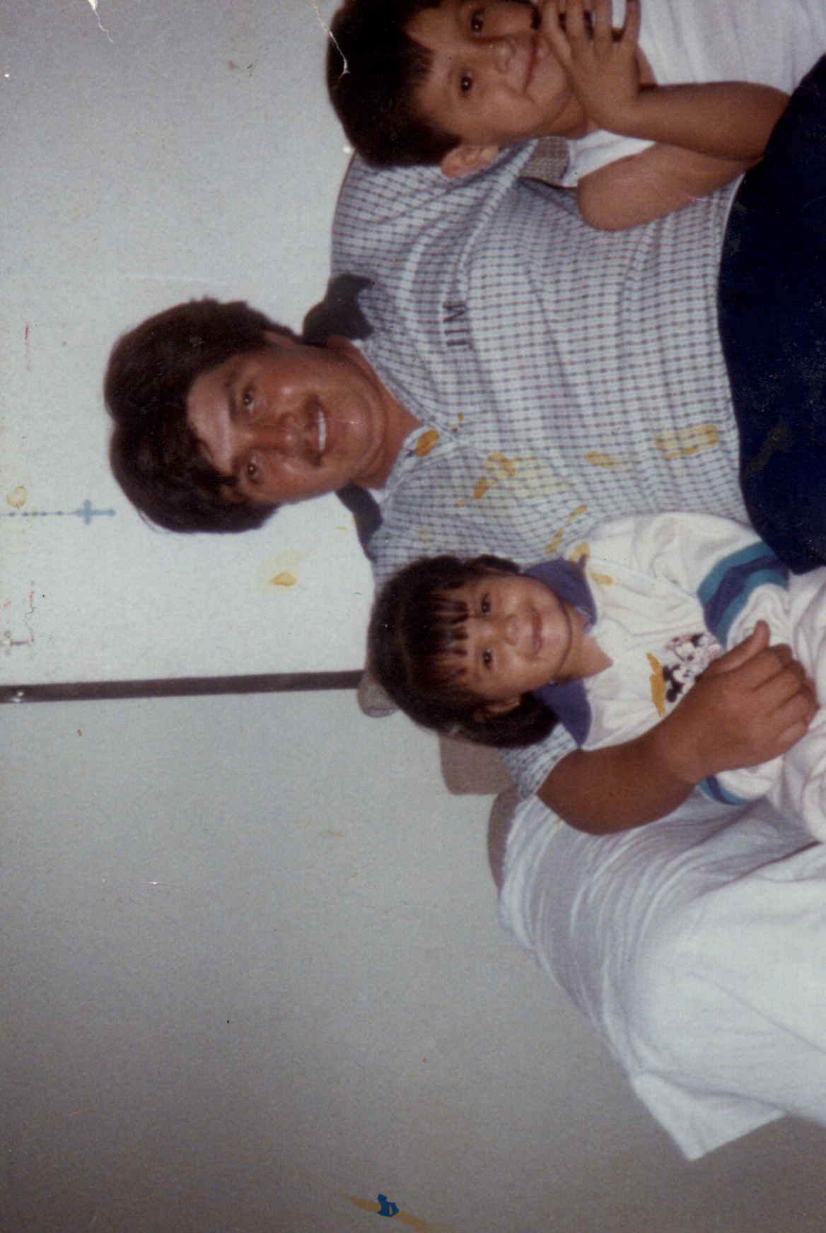 Fotografía a color que muestra a un adulto sentado con dos niños pequeños. El adulto viste una camisa a cuadros y sonríe a la cámara. A su izquierda hay una niña pequeña con pelo corto y oscuro, vestida con un suéter claro. A su derecha aparece un niño también de pelo oscuro. Forma parte de una colección personal.