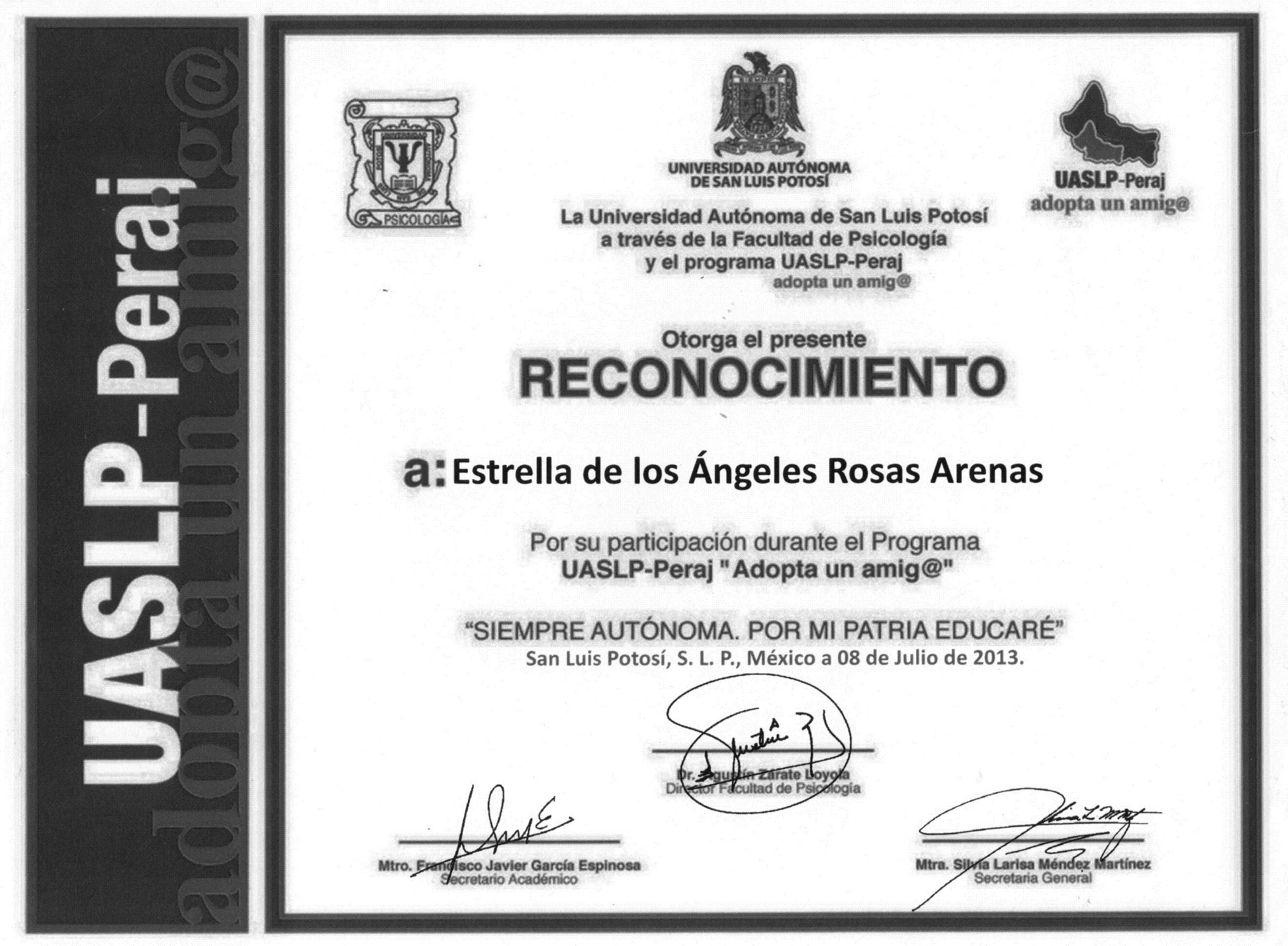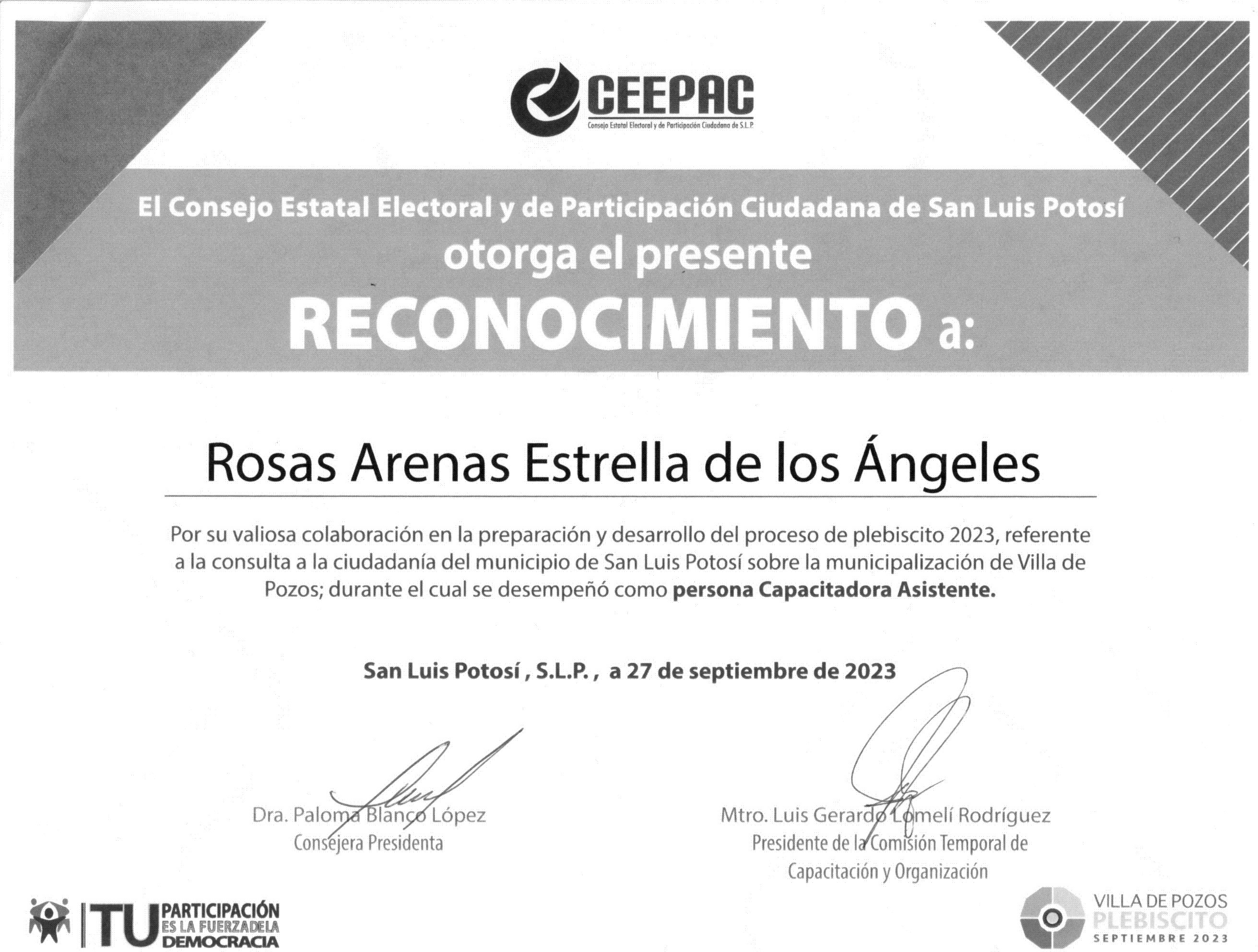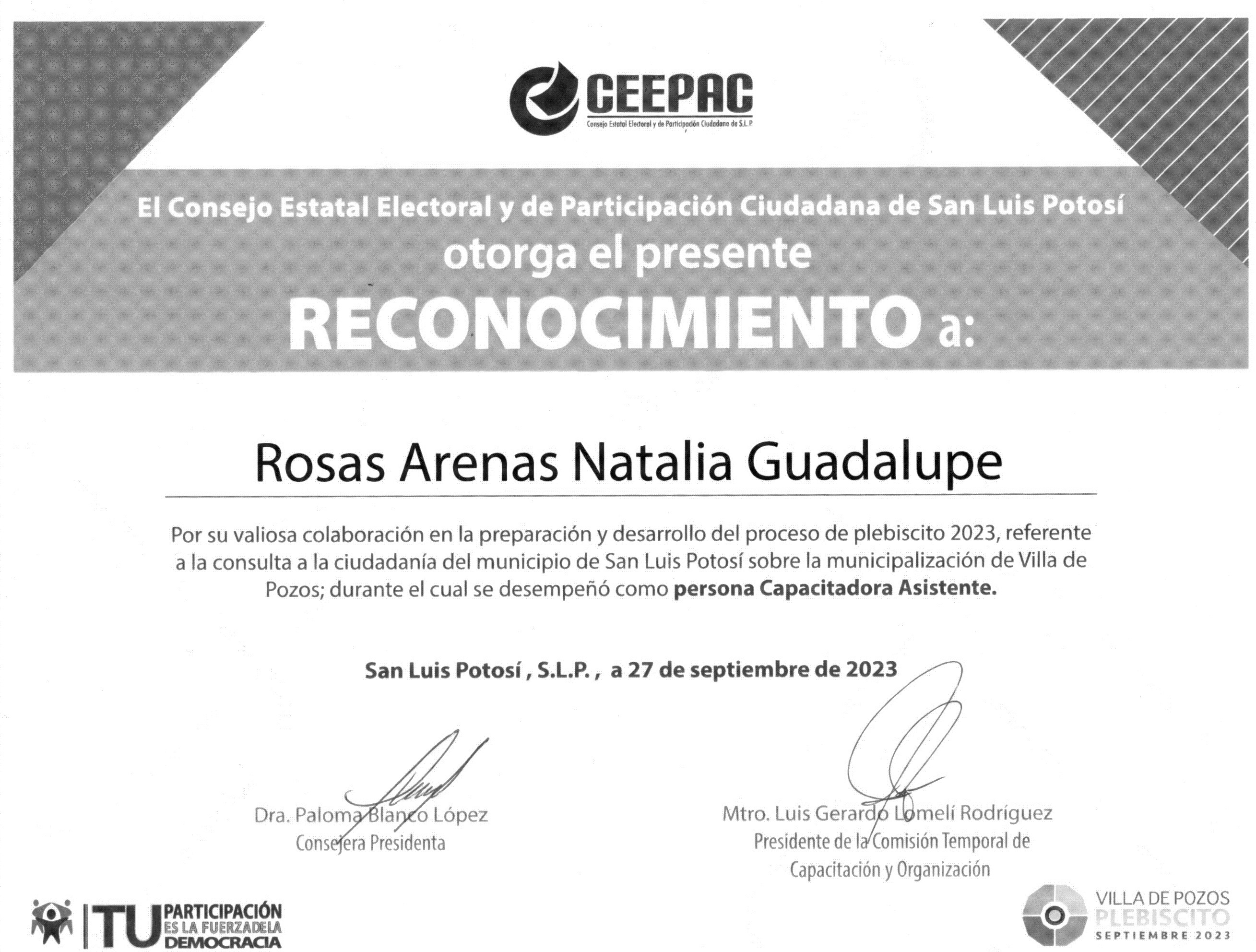 En este expediente se incluyen varios reconocimientos correspondientes a la ingeniera María Bibiana Arenas Martínez, enfocados principalmente en el ámbito laboral. También se encuentran documentos que acreditan logros tanto laborales como académicos de la ingeniera Estrella de los Ángeles Rosas Arenas. Además, el expediente contiene reconocimientos y constancias a nombre de la señorita Natalia Guadalupe Rosas Arenas, relacionados con su participación en actividades tanto académicas como laborales