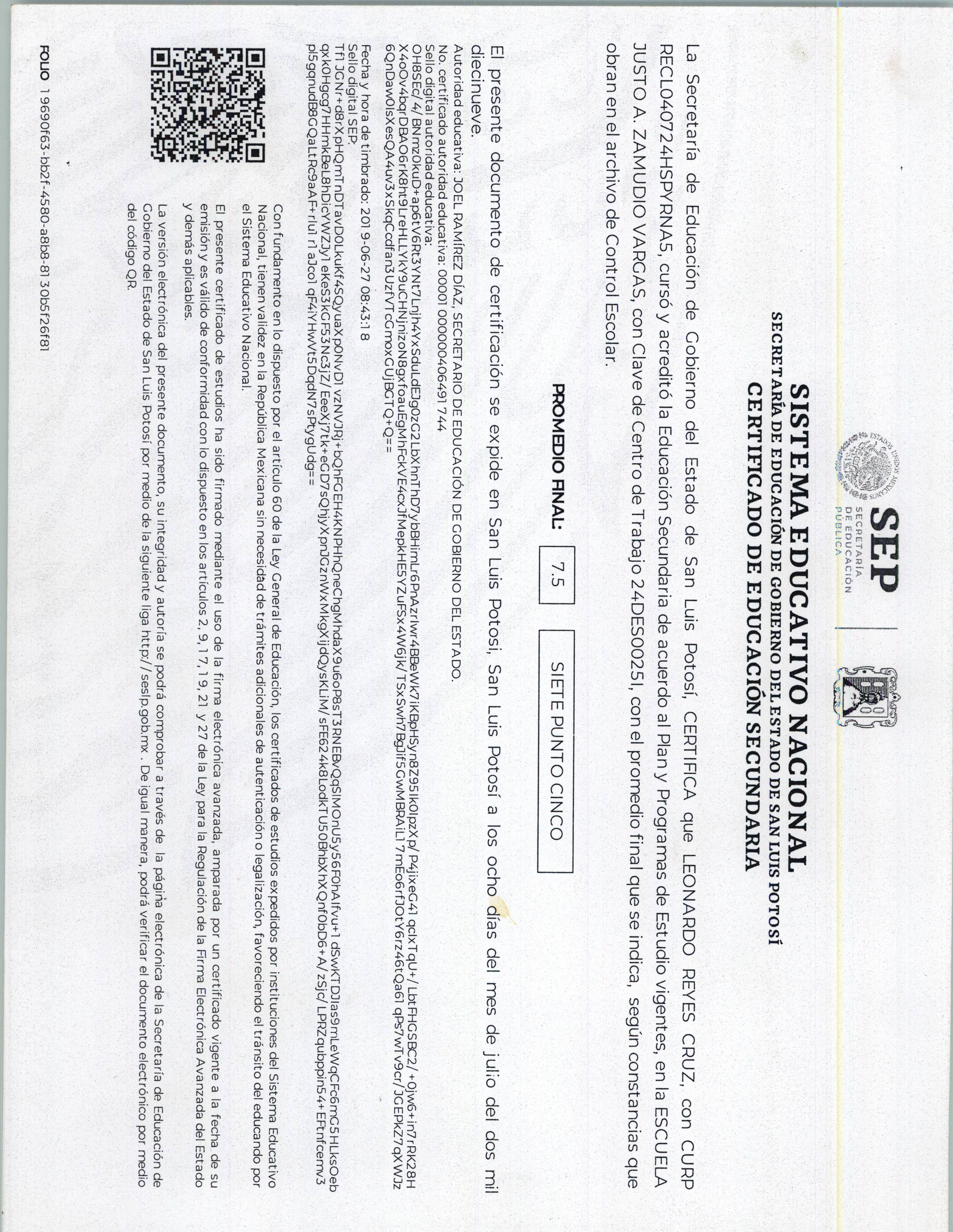 Certificado de Educacion Secundaria con promedio de 7 de leonardo reyes