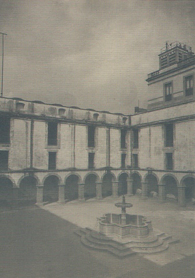 Postal con fotografía del interior del Palacio Municipal en Puebla, México; se puede observar una fuente en el centro del patio.