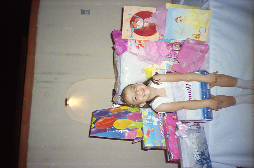 Se observa a una niña sonriente, sentada en una mesa llena de regalos envueltos y bolsas de obsequio. La escena muestra un momento de celebración de cumpleaños, donde la niña parece feliz y rodeada de sus presentes. Los regalos varían en tamaño y diseño, indicando la diversidad de obsequios recibidos.