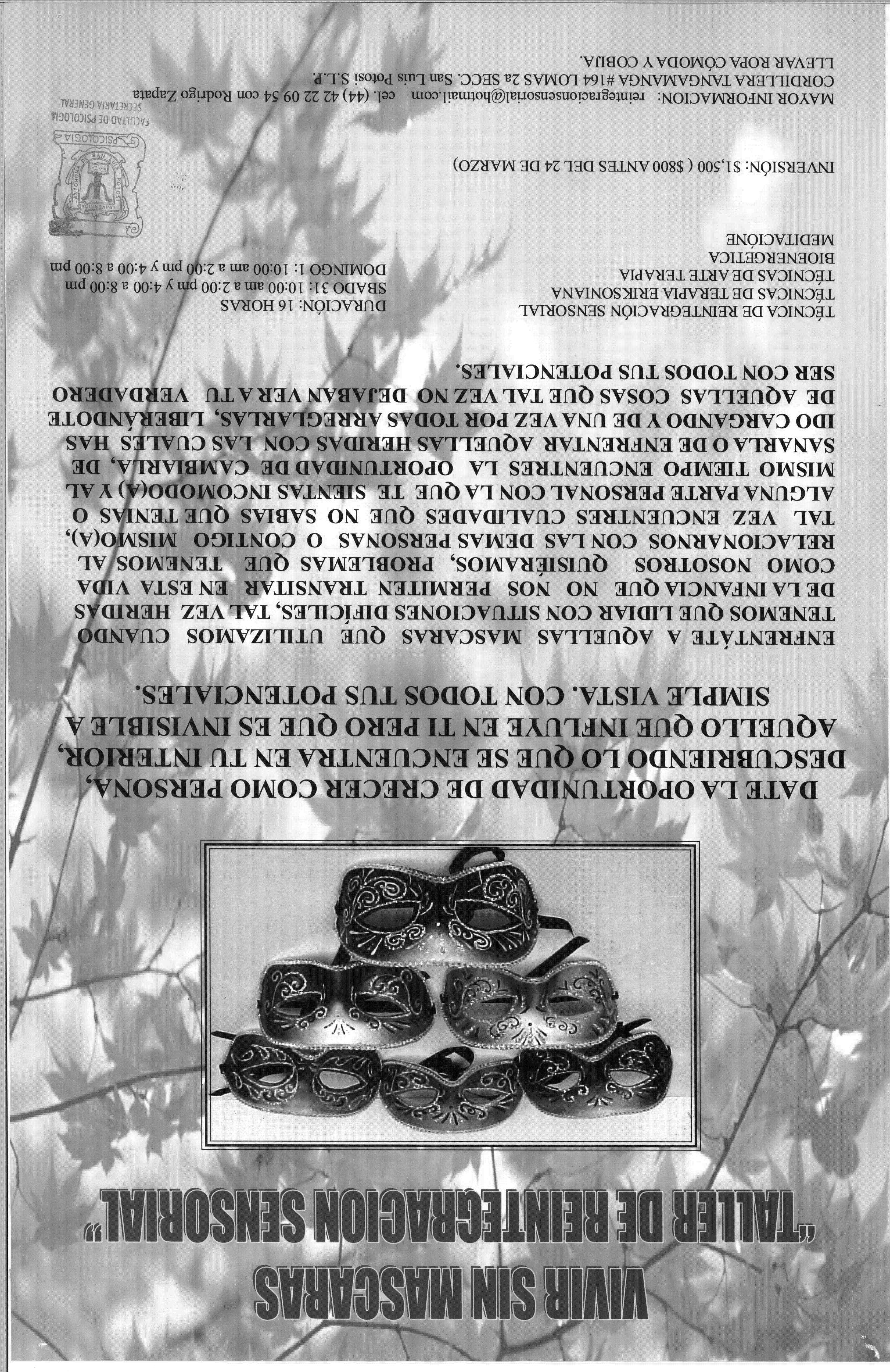 Es un cartel promocional de un taller vivencial orientado a la sanación interior y el crecimiento personal. Se enfoca en ayudar a los participantes a identificar y trabajar con las "máscaras" emocionales que usamos para enfrentar situaciones difíciles, especialmente aquellas derivadas de heridas de la infancia. Propone un proceso de liberación emocional y autodescubrimiento para vivir con mayor autenticida.