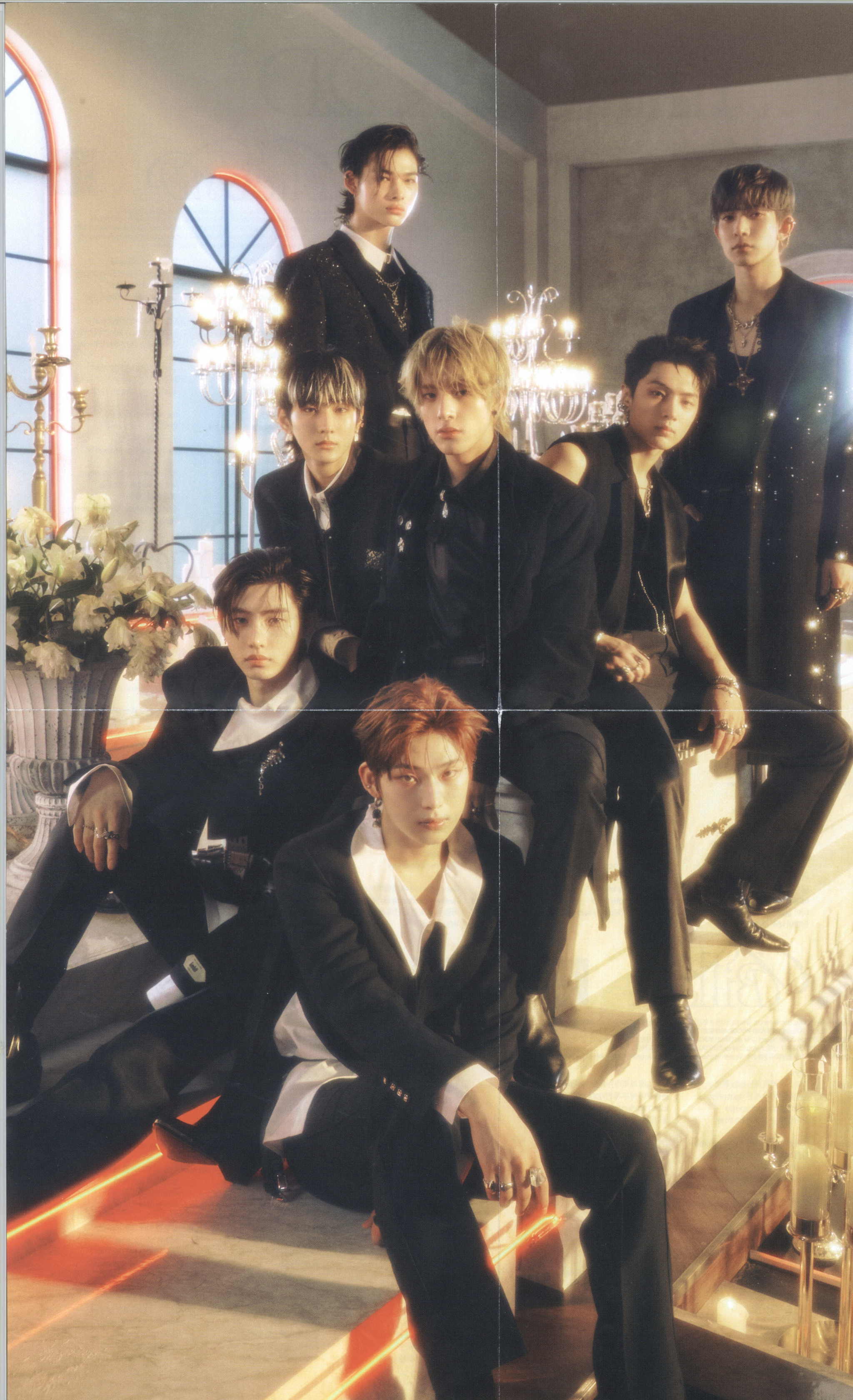 En este cartel podemos encontrar a una boyband de kpop llamada ENHYPEN que la cual están posando para el concepto del álbum llamado DARK BLOOD para la versión del álbum FULL.