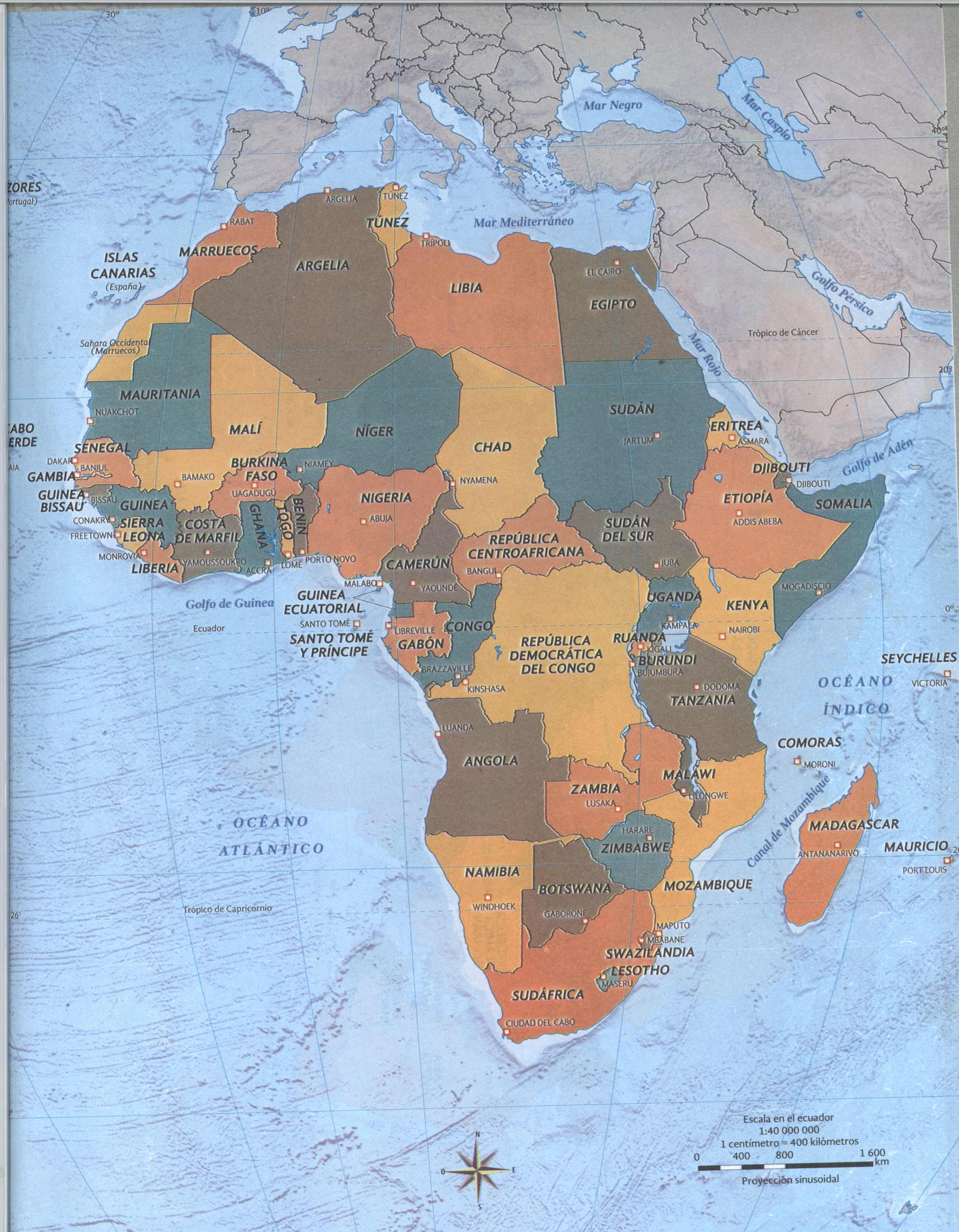 La imagen representa por diferentes colores los paises del continente de Africa del Océano Atlántico