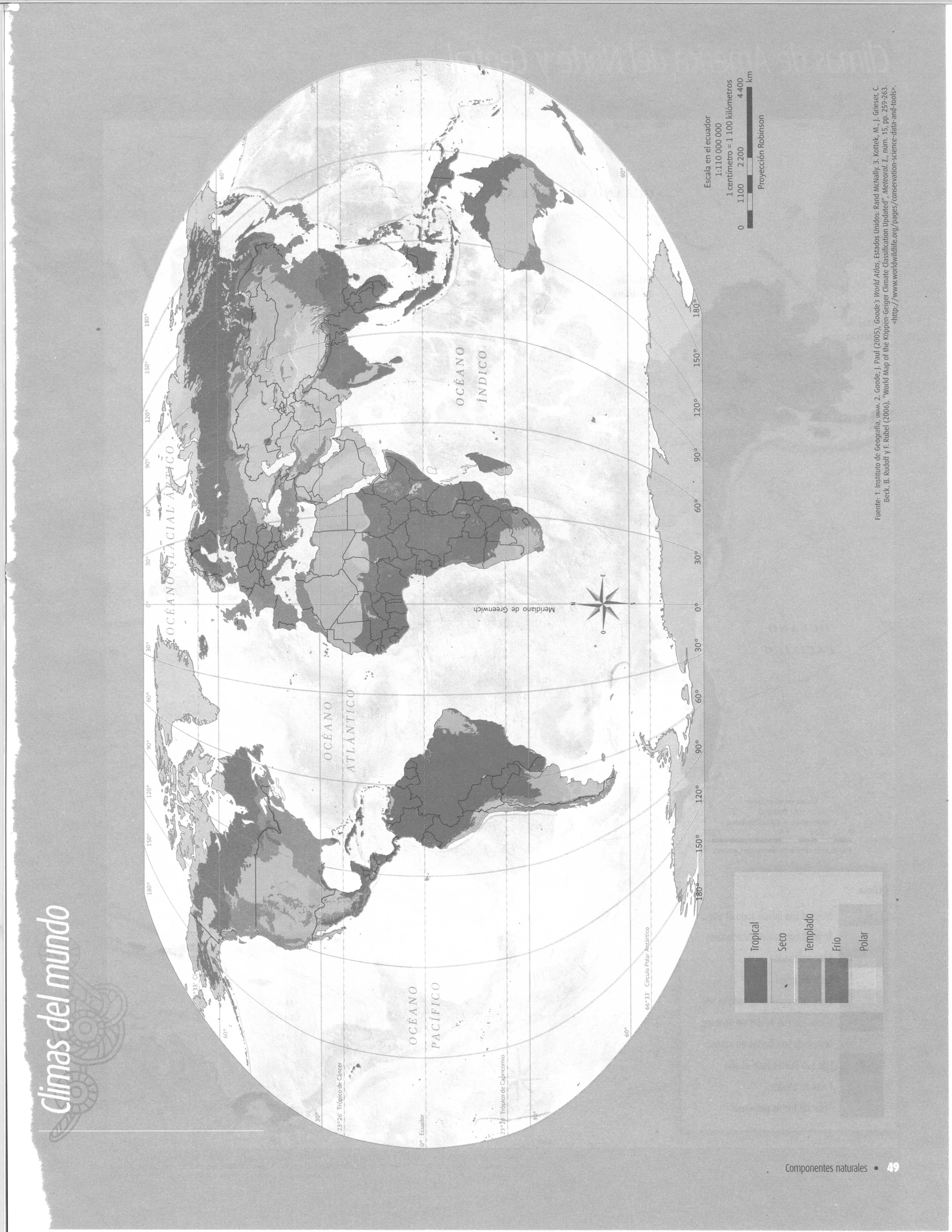 Es un mapa temático mundial titulado "Climas del mundo", el cual muestra la distribución global de los principales tipos de clima del planeta. Su propósito es ofrecer una visión general de las zonas climáticas, categorizadas de manera amplia.