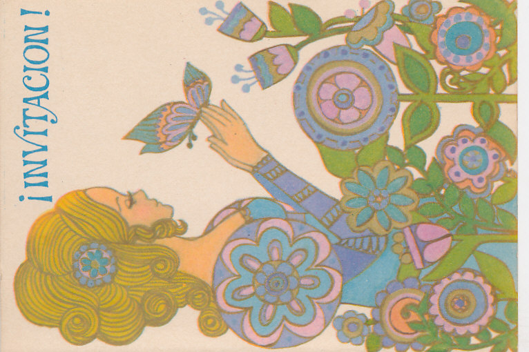 La imagen presenta una invitación con una estética psicodélica o de arte pop. Una figura femenina de cabello rubio y ondulado yace rodeada de flores y formas abstractas en tonos pastel. Ella extiende su mano hacia una mariposa de diseño similar. La palabra "¡Invitación!" aparece verticalmente a la izquierda, sugiriendo un evento con un ambiente creativo y alegre.