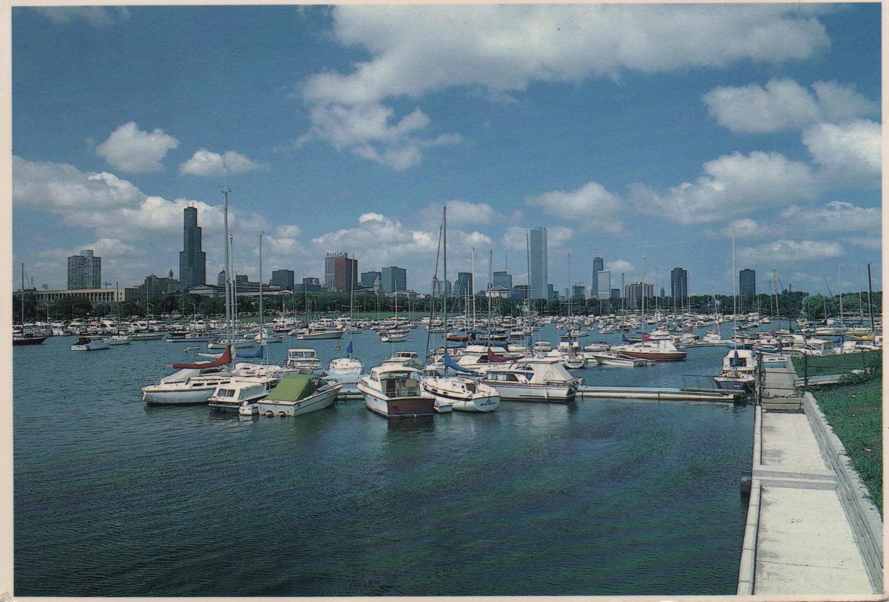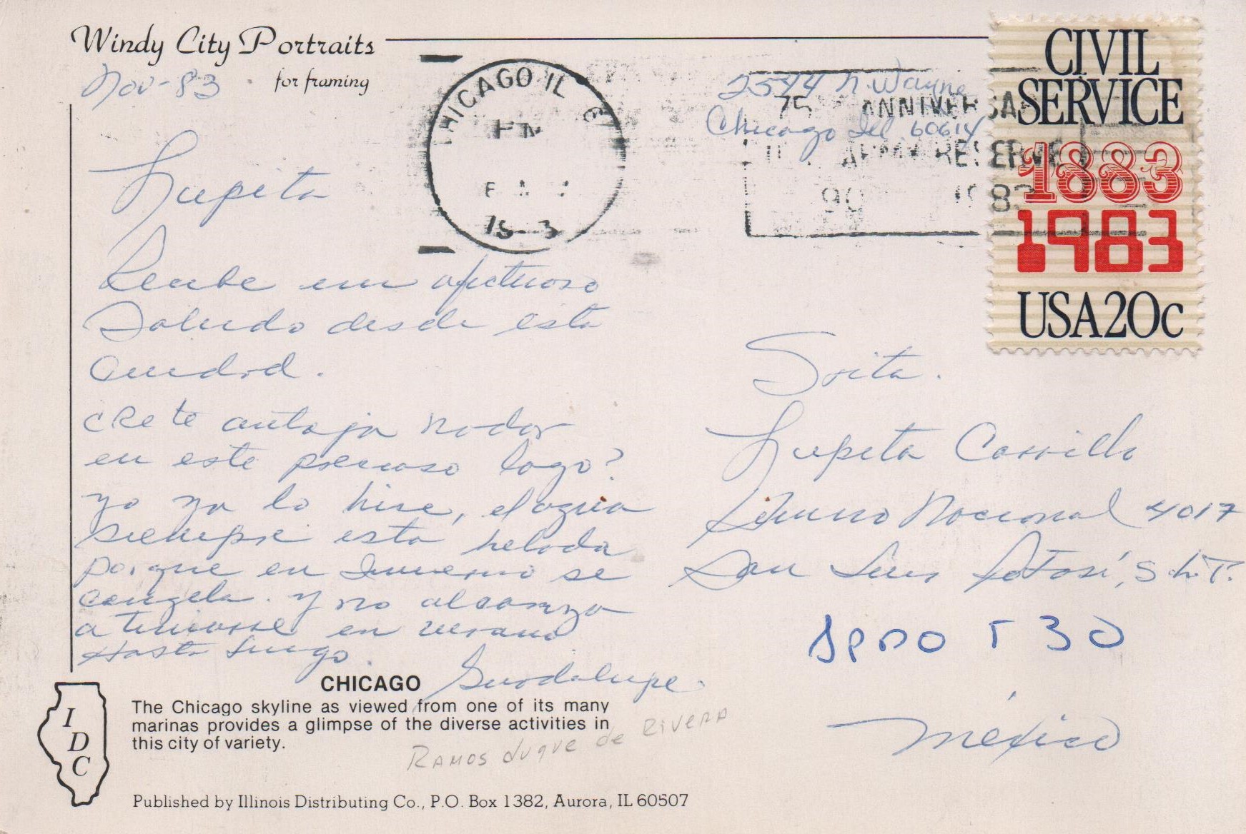La postal muestra una vista panorámica del skyline de Chicago, Estados Unidos, con numerosos botes y yates atracados en un puerto deportivo bajo un cielo despejado. Al reverso, se encuentra un mensaje manuscrito enviado en noviembre de 1983 desde Chicago, dirigido a Lupita Carrillo en San Luis Potosí, México. El texto expresa saludos afectuosos y reflexiones personales sobre la ciudad y su clima, y destaca el contraste entre el verano y el invierno en la región. La postal también lleva un sello conmemorativo del servicio civil estadounidense.