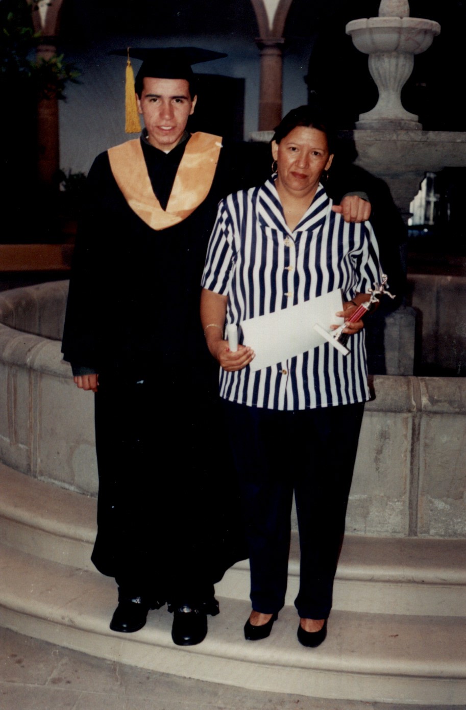 En esta fotografia podemos ver a dos personas de diferentes edades (mamá e hijo) estan parados en unas fuente donde se realizo la graduacion ya que el hijo tiene atuendo acorde a una graduacion