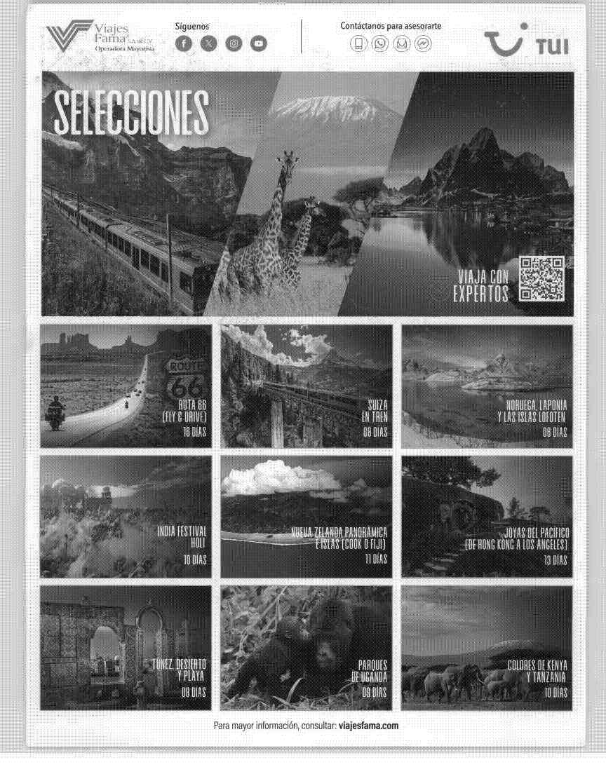 En el cartel nos habla de destinos turísticos internacionales. muestra un collage de tres imágenes impactantes: un tren atravesando un paisaje montañoso, jirafas en la sabana africana. Al lado derecho aparece la frase "VIAJA CON EXPERTOS" junto a un código QR para obtener más información. El cartel está organizado en una cuadrícula de nueve destinos distintos, cada uno con una fotografía evocadora y la información básica del viaje: 1. Ruta 66 (FLY & DRIVE) 16 días . 2. Suiza en Tren 09. 3. Noruega, Laponia y las Islas Lofoten 08 4. India Festival Holi 10 dias. 5. Nueva Zelanda Panorámica 11 días. 6. Joyas del Pacífico 13 días 7. Túnez, Desierto y Playa 08 dias. 8. Parques de Uganda 09 dias 9. Colores de Kenya y Tanzania 10 dias .