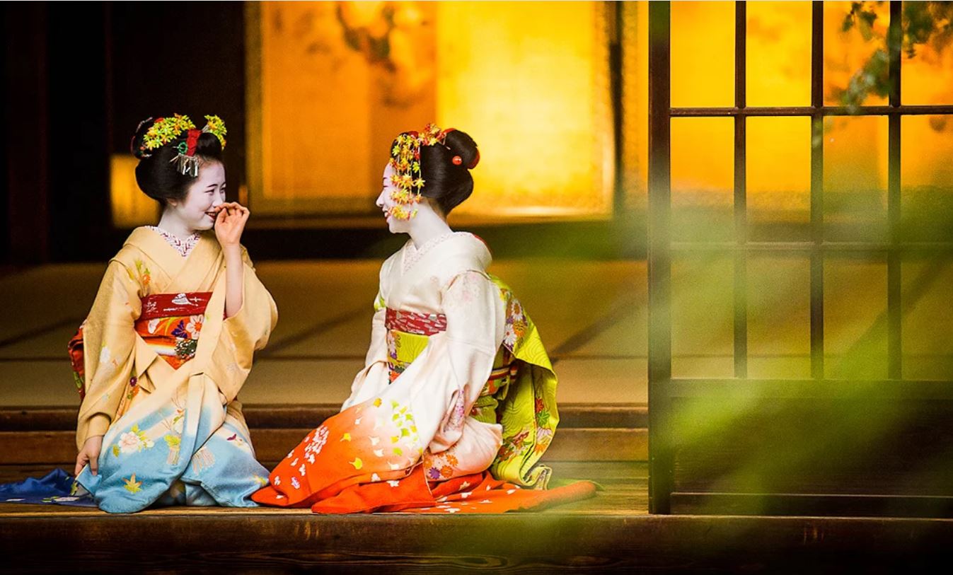 Fotografía artística que captura a dos maikos sentadas en el suelo de madera de un espacio tradicional japonés. Las jóvenes visten kimonos: una en tonos amarillo pálido con azul en la parte inferior, y la otra con kimono blanco y detalles en rojo y amarillo. Sus peinados tradicionales están adornados con horquillas decorativas coloridas (kanzashi).
