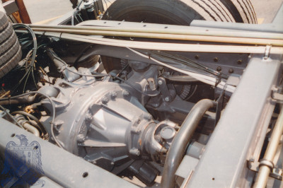 Fotografía que muestra el bajo chasis de un vehículo, enfocándose en el diferencial y el eje de transmisión. Este componente es crucial para la distribución del torque del motor entre las ruedas, permitiendo que giren a diferentes velocidades en curvas y superficies irregulares.