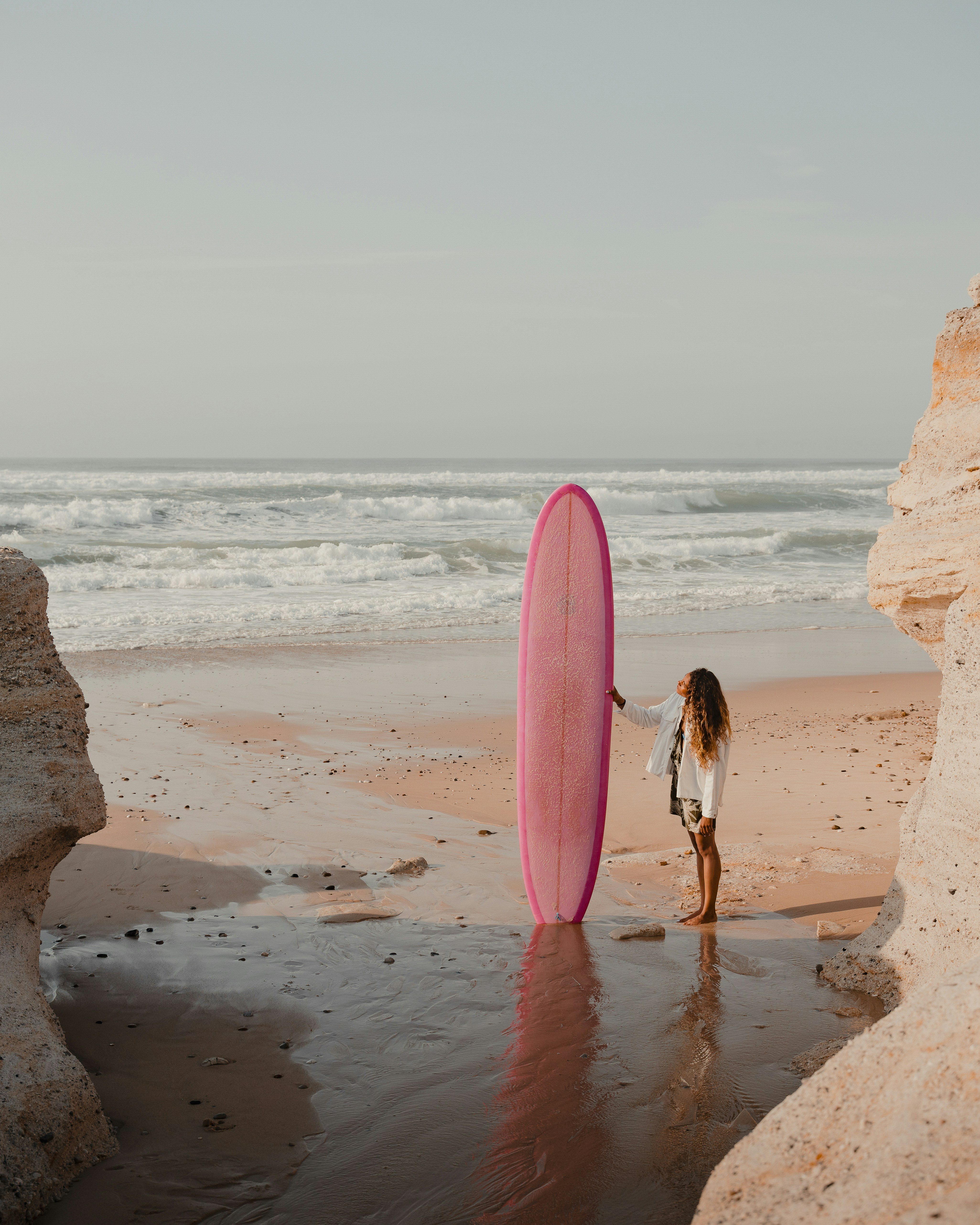 Mujer en la playa con su tabla de surf.