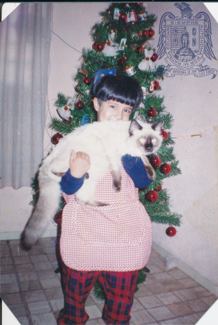 Niño cargando a su mascota en épocas navideñas