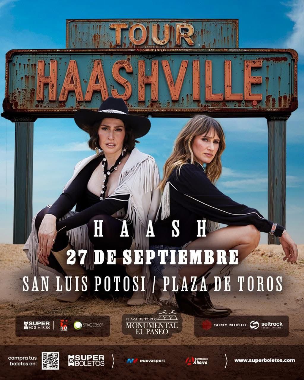 Cartel promocional del concierto de Ha*Ash, correspondiente a su "Tour Haashville", que se llevará a cabo el 27 de septiembre en la Plaza de Toros Monumental El Paseo, en San Luis Potosí, México. El diseño presenta a las artistas en un entorno tipo western, con información sobre la venta de boletos y patrocinadores.