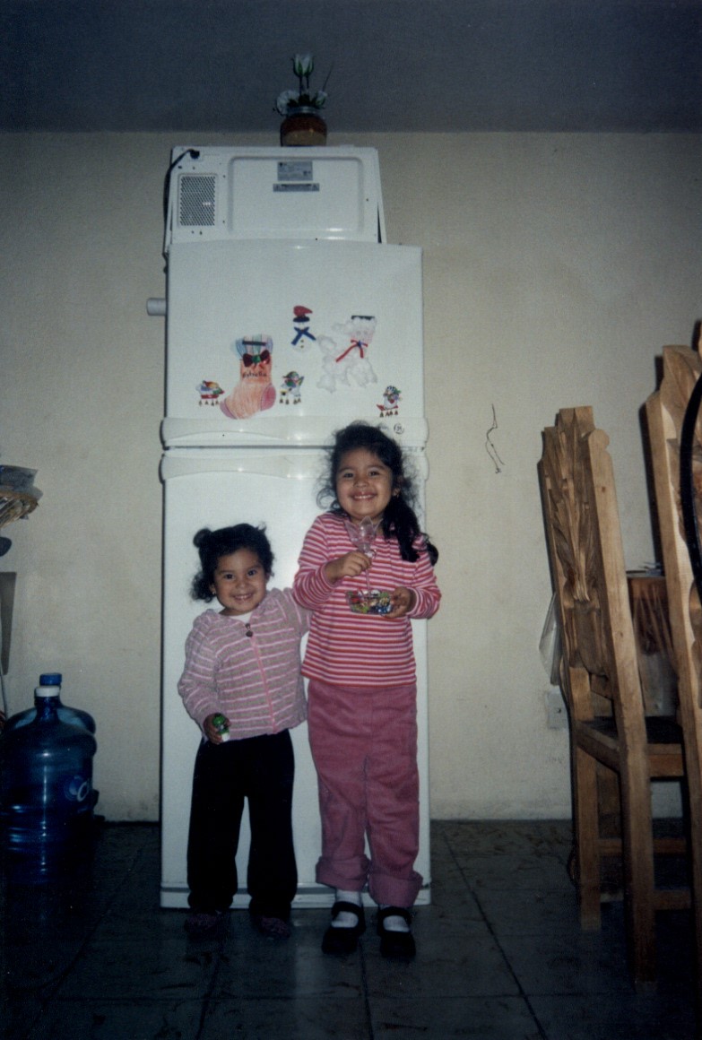 En esta imagen se captura a dos hermanas abrazadas dentro de una casa, mientras sostienen con un proyecto escolar