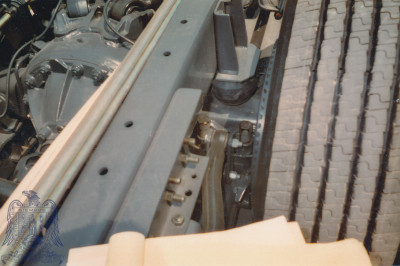 Fotografía del chasis de un vehículo, destacando la suspensión y el sistema estructural. Se observan componentes mecánicos como soportes, pernos, barras de ajuste y una rueda, mostrando la integración de elementos que permiten estabilidad y seguridad en el funcionamiento del automóvil.