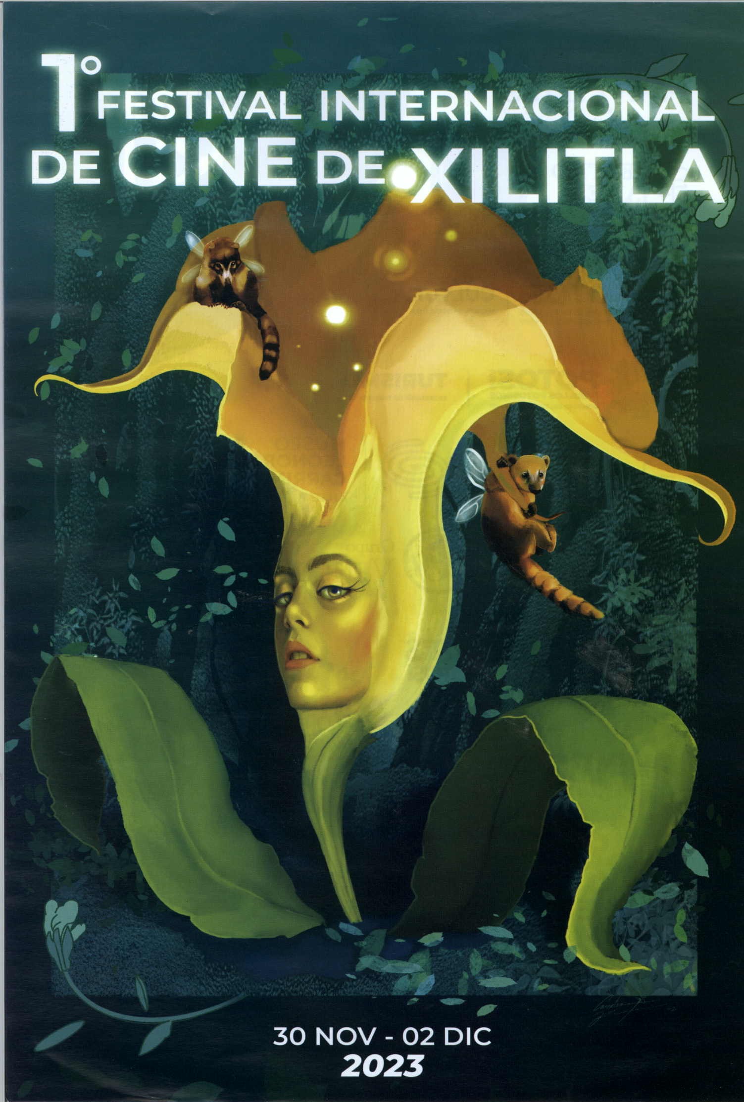 En este cartel se difunden las fechas del 1° Festival Internacional de Cine de Xilitla, acompañado de una imagen representativa que captura la esencia del evento. La ilustración muestra una flor con el rostro de una mujer en su centro, mientras que sus hojas están adornadas con detalles de fauna, abarcando todo el cartel
