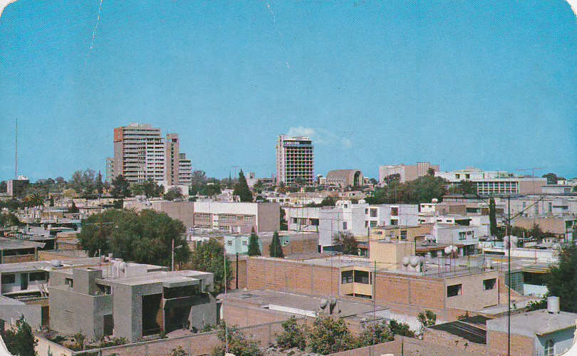 La imagen ofrece una perspectiva elevada de una sección de la ciudad de Monterrey. Se observan edificios de diferentes alturas y estilos arquitectónicos, incluyendo algunos rascacielos y construcciones más bajas. La presencia de árboles dispersos entre las edificaciones sugiere áreas residenciales y comerciales. El cielo azul y brillante ilumina la escena urbana.