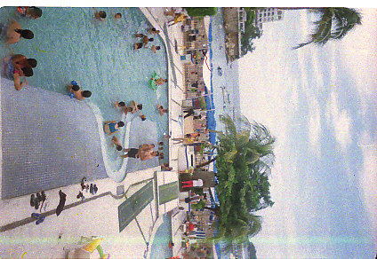 La imagen muestra una alberca en un hotel con vista al mar, la cual muestra una gran cantidad de personas disfrutando de ella.