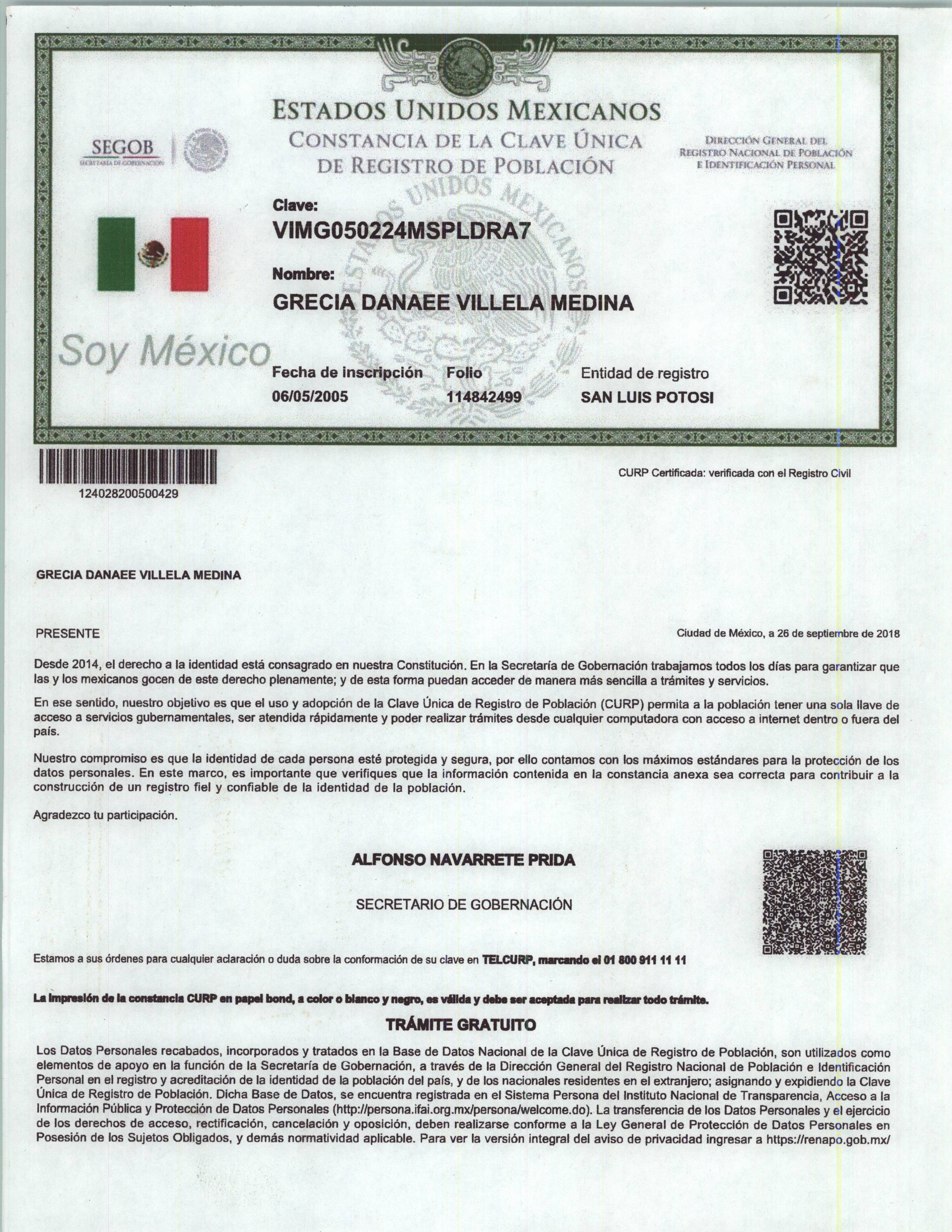 Documento oficial emitido por la Secretaría de Gobernación de México que certifica la asignación de la Clave Única de Registro de Población (CURP) a un ciudadano mexicano.