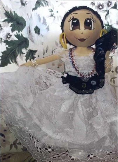Fotografía de manualidad; muñeca hecha de foami; representa a una bailarina de baile tradicional, lleva puesto un vestido de encaje blanco, collares de perlas de colores y accesorios llamativos.