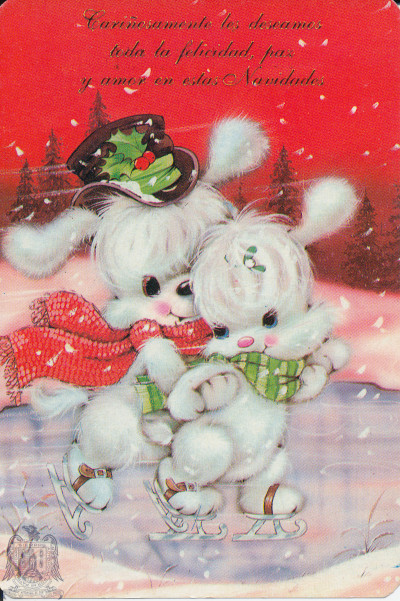 Postal de navidad de conejitos abrazados color rojo con texto en el reverso