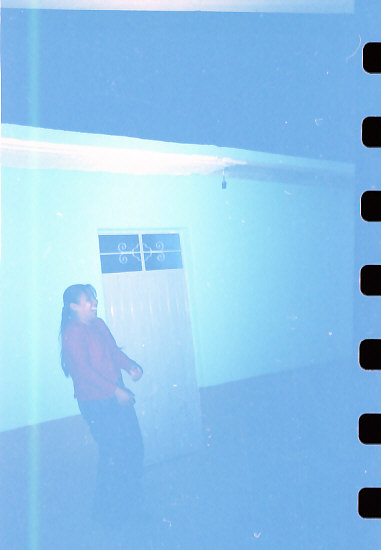 Esta fotografía muestra de una mujer de pie frente a lo que parece ser la entrada de una vivienda rural o estructura habitacional sencilla. La imagen colores con tonalidades turquesa y rosadas que sugieren un efecto de iluminación artificial o posiblemente un efecto fotográfico especial.