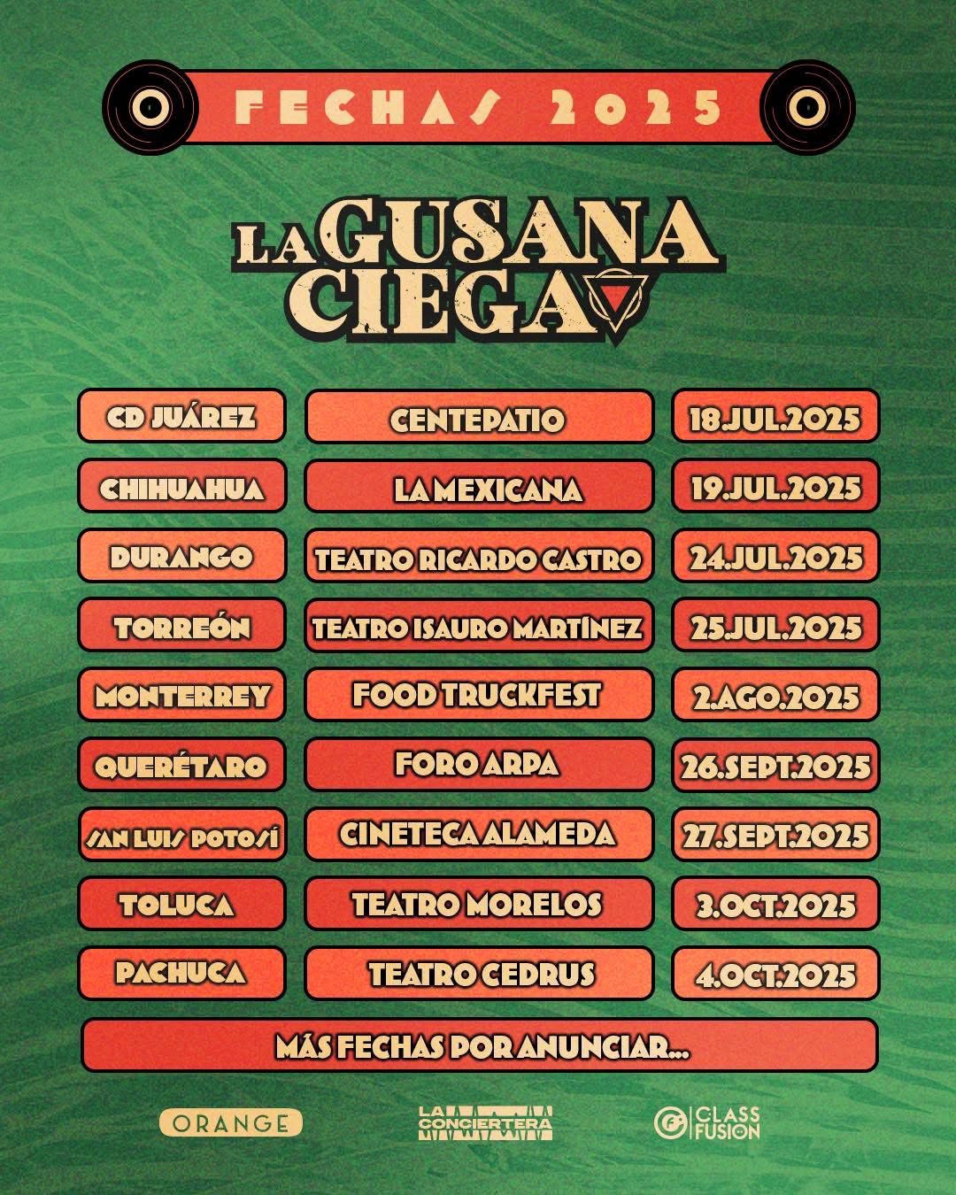 Cartel promocional que presenta las fechas y ciudades de la gira nacional 2025 de la banda de rock mexicana La Gusana Ciega. Se menciona el evento en la Cineteca Alameda de San Luis Potosí el 27 de septiembre de 2025. También aparecen los logotipos de los organizadores Orange, La Conciértera y Class Fusion. El diseño utiliza una paleta de colores verde y rojo con estilo retro.
