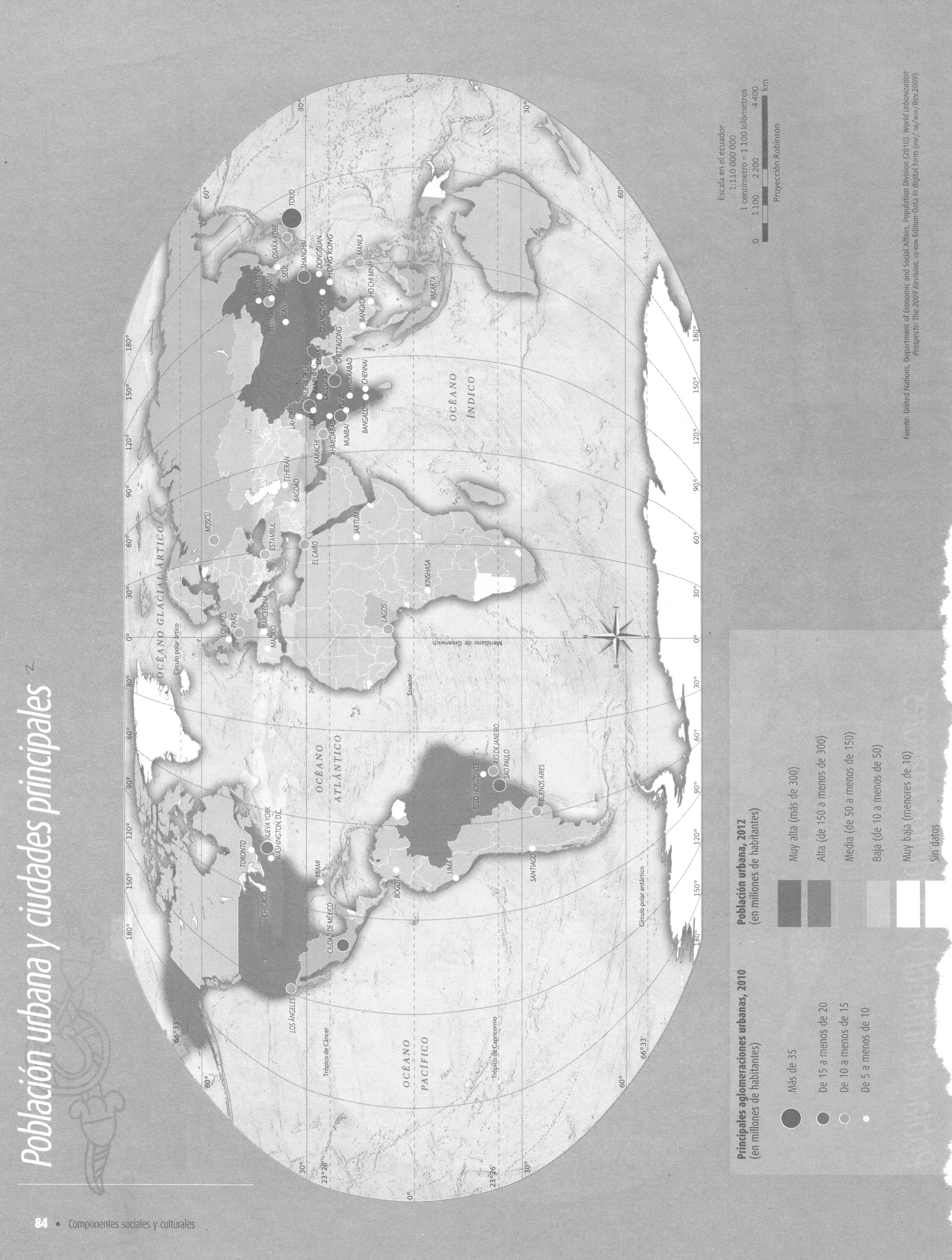 Un mapa que describe de manera ilustrativa la población urbana y ciudades principales del mundo.