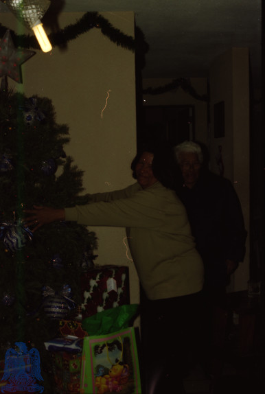 Fotografia a color de Guadalupe decorando el arbol de navidad
