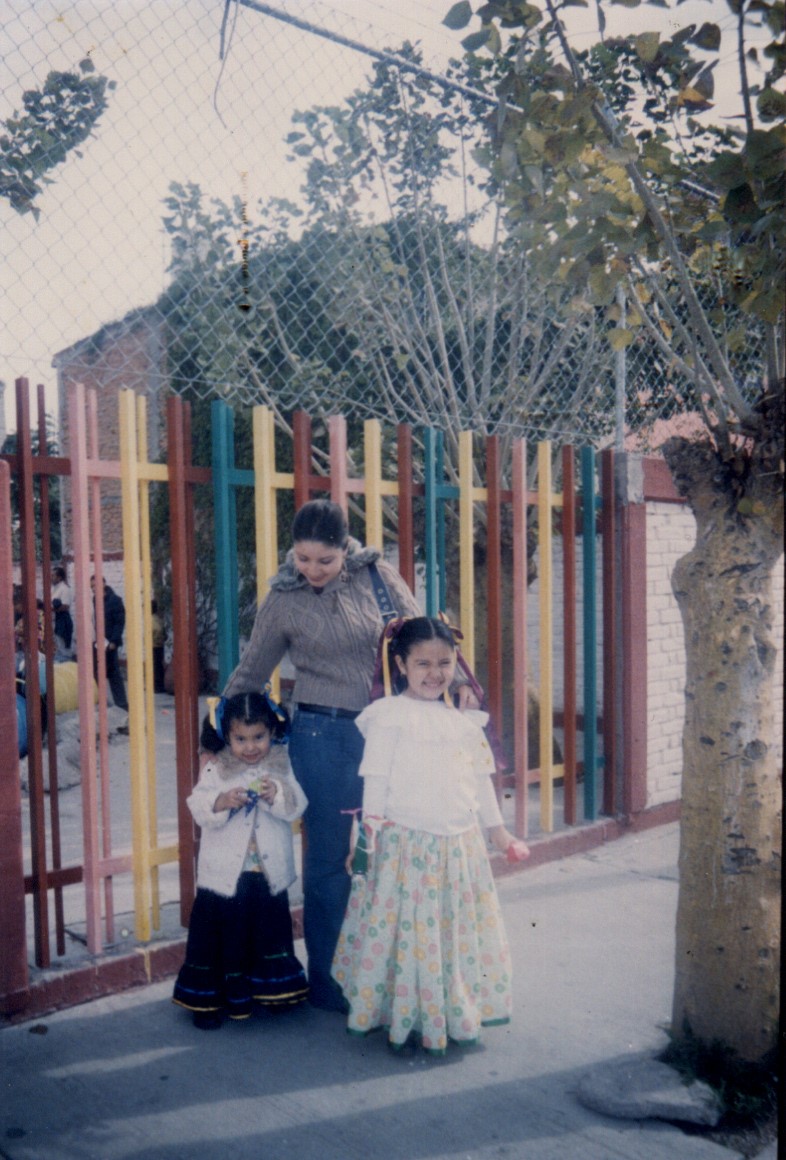 En esta imagen se captura el emotivo momento al final de una presentación en un festival infantil con motivo de las festividades patrias. En la foto, unas niñas, vestidas con trajes típicos, posan junto a su mamá, compartiendo juntas la alegría de haber participado en este evento tan especial