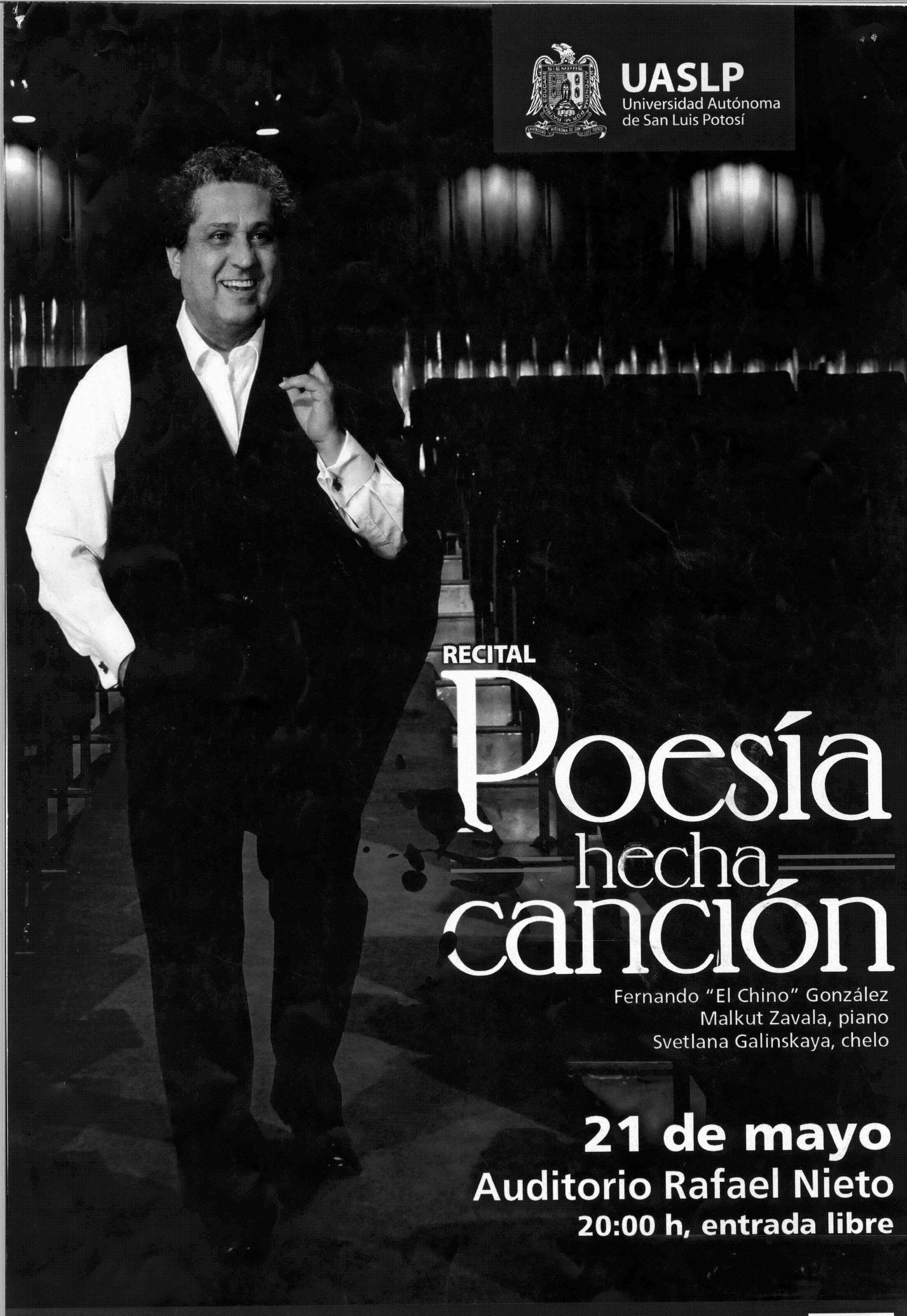 Recital "Poesía hecha canción" (UASLP) Afiche cultural que promociona un recital titulado “Poesía hecha canción” con entrada libre, que se realizará el 21 de mayo en el Auditorio Rafael Nieto. El evento combina música y poesía.