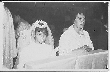 Niña presentandose en su primera comunión junto a su madrina