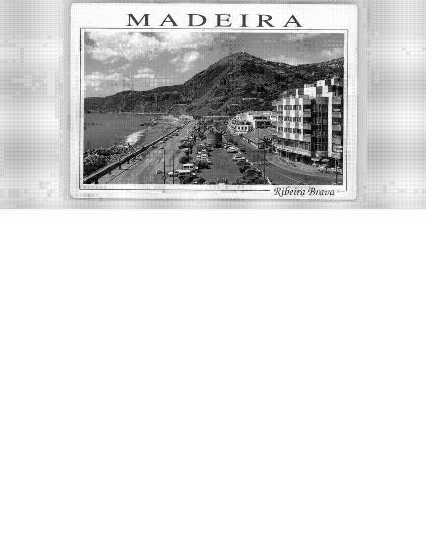 En la postal , enmarcada por un sencillo borde blanco, presenta una composición panorámica que abarca una amplia vista de este enclave costero. La imagen ha sido tomada desde un punto elevado, posiblemente desde una colina o edificio, lo que permite apreciar la disposición urbanística y geográfica de Ribeira Brava en todo su esplendor. En primer plano se observa una amplia avenida costera con varios automóviles estacionados, evidenciando que se trata de una zona urbana desarrollada y con actividad turística. Esta avenida corre paralela a la costa, separando la línea de edificios de la playa. A la derecha de la imagen se aprecia una serie de edificios modernos de varias plantas, probablemente hoteles o apartamentos turísticos, con arquitectura característica de mediados del siglo XX, con balcones y una disposición escalonada que permite aprovechar las vistas al mar. La línea costera forma una bahía natural de aguas tranquilas que se curva suavemente, con una playa que parece ser de arena oscura o guijarros, característica de las islas volcánicas como Madeira. Se puede distinguir un paseo marítimo o malecón que bordea la playa, ofreciendo un espacio para el disfrute del paisaje marino. Al fondo y dominando la escena, se alzan imponentes montañas escarpadas que son tan características del paisaje de Madeira. Estas elevaciones muestran laderas pronunciadas que descienden prácticamente hasta el nivel del mar, ilustrando la naturaleza volcánica y abrupta de la isla. La vegetación parece escasa en estas laderas, dejando ver la textura rocosa del terreno